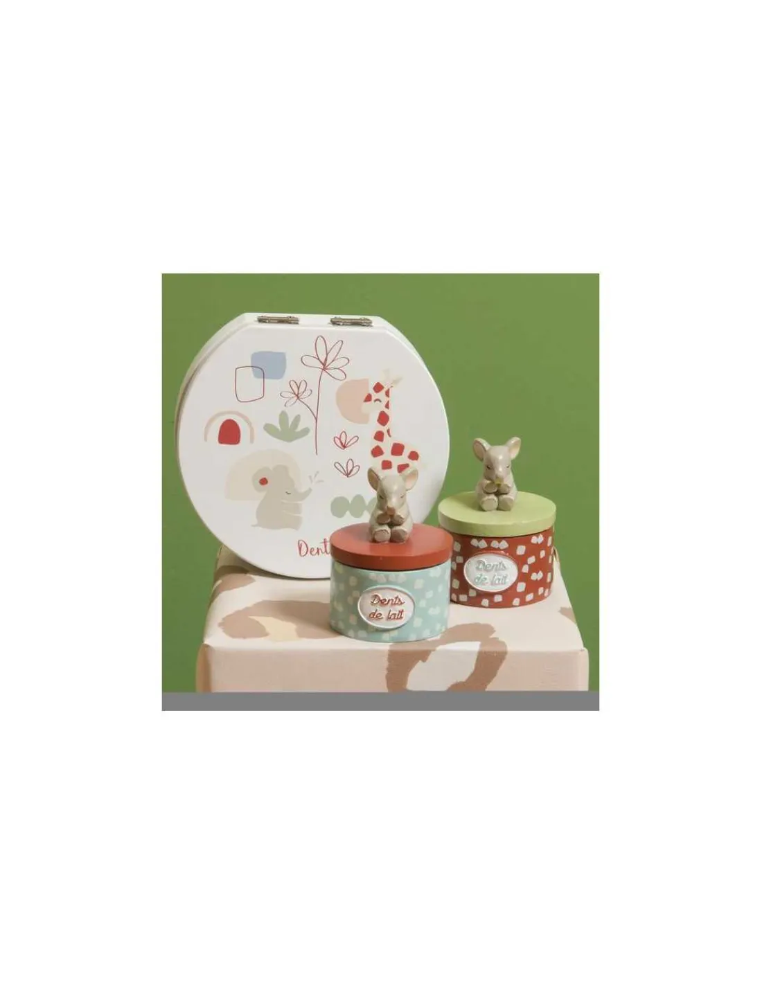 Découvrez la boite à dents Rêverie d’ailleurs de Amadeus Les Petits, une boite à quenottes en bois, illustrée sur le thème de la jungle avec une girafe et un éléphant, qui gardera précieusement les premières dents de votre enfant.