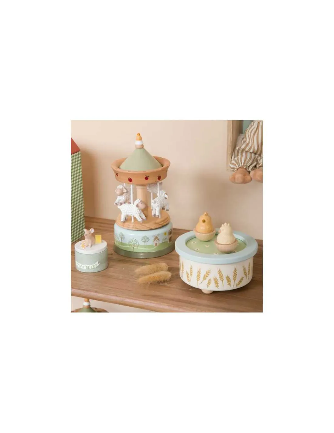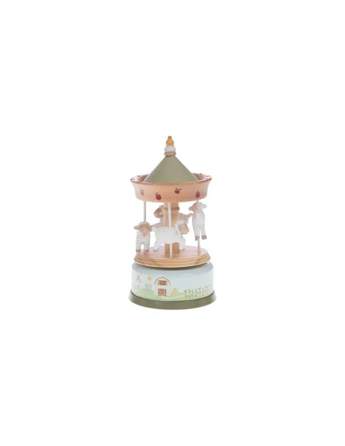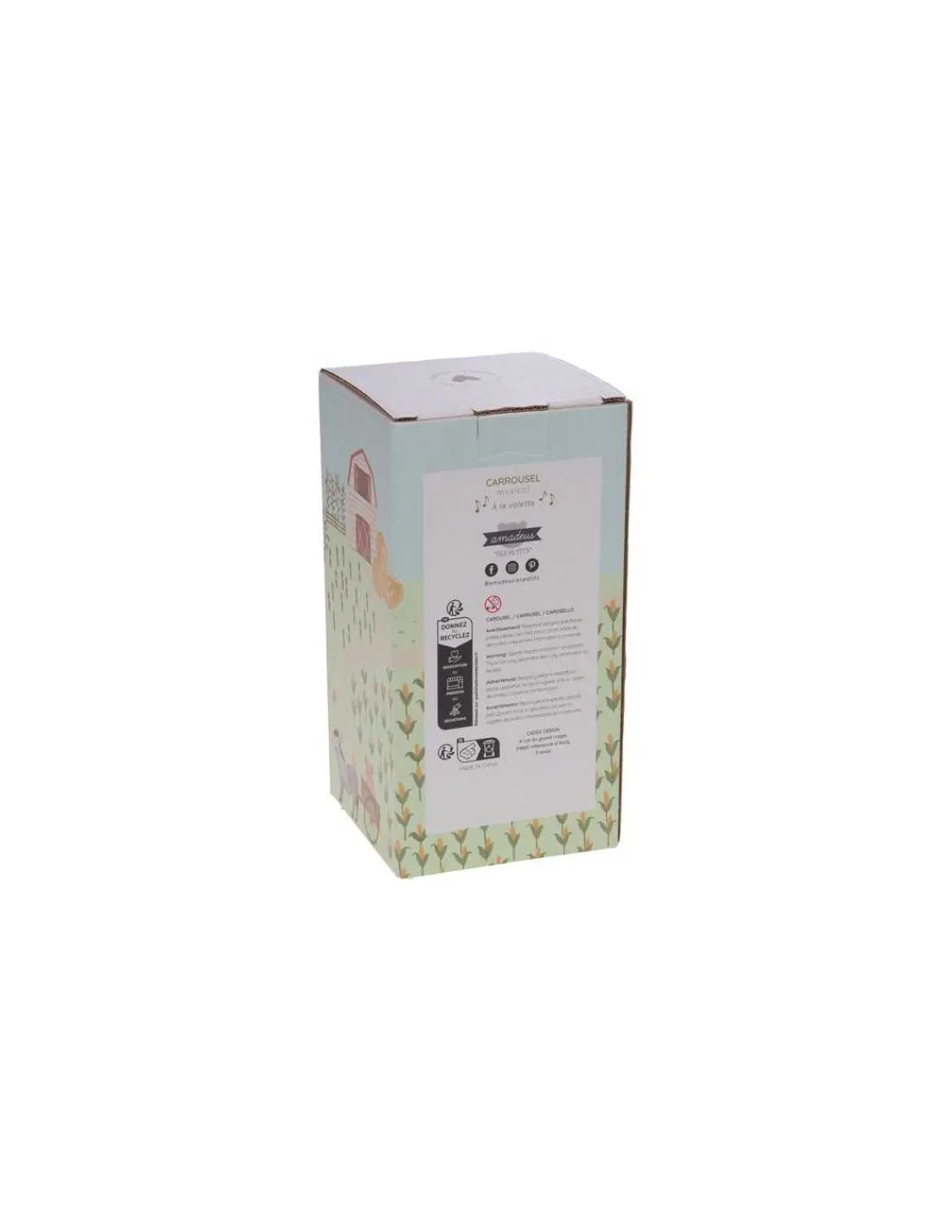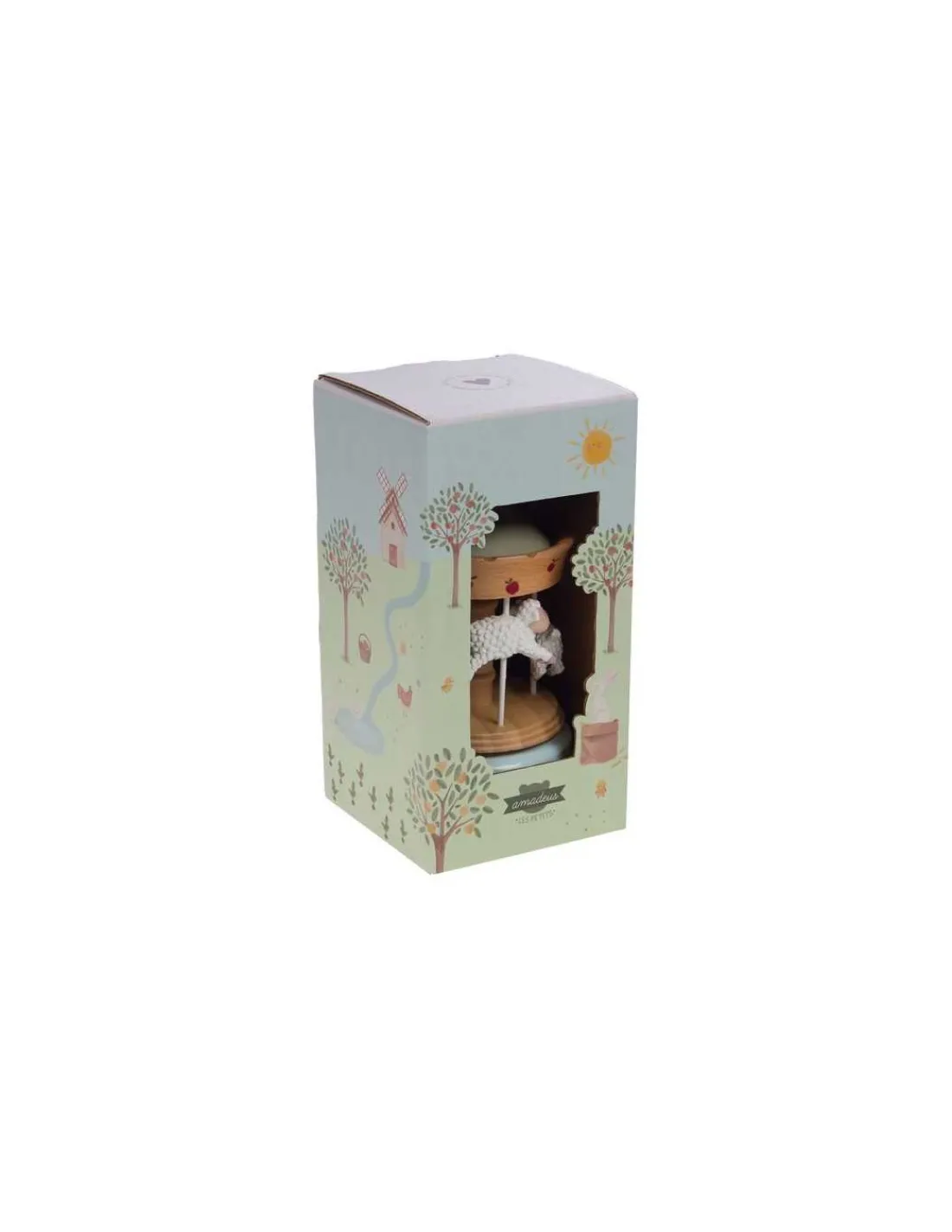 Découvrez la boite à musique carrousel Louison à la ferme de Amadeus Les Petits, un cadeau de naissance décoratif avec une douce mélodie. Un manège musical au design rétro d’antan.