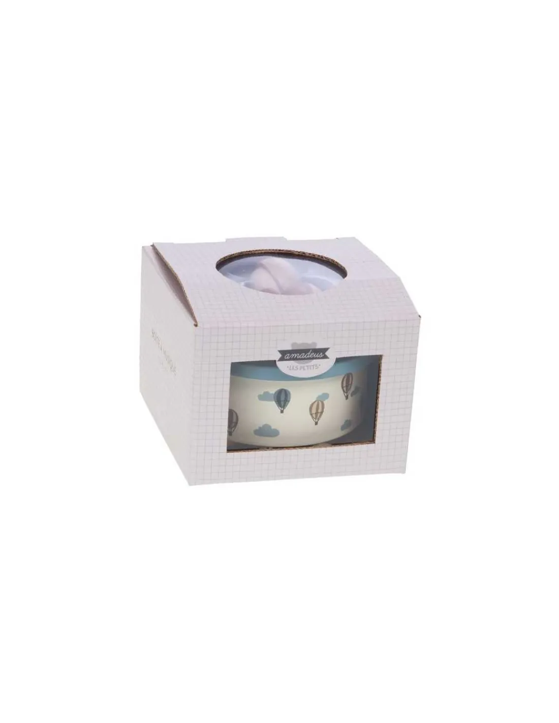 Découvrez la boite à musique montgolfière de Amadeus Les Petits, un cadeau de naissance décoratif avec une douce mélodie. Un manège musical avec un ours et un lapin qui tournent au son de la musique « Frère Jacques ».