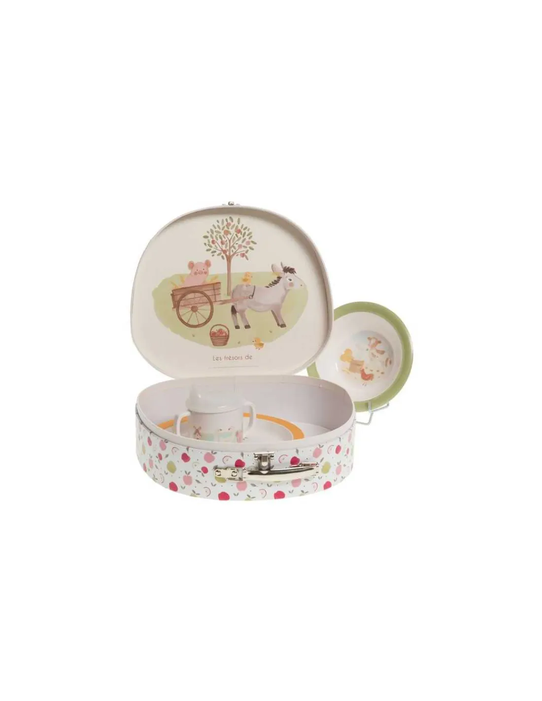 Découvrez le coffret repas valisette Esteban de Amadeus Les Petits, une adorable valise contenant un ensemble de vaisselle conçu spécialement pour les enfants. Ce coffret de 5 pièces comprend une assiette, un bol, un verre, une cuillère et une fourchette, tous illustrés avec soin sur le thème de la ferme.