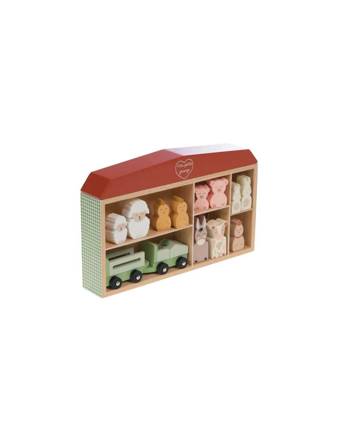 Découvrez Ma petite grange et les animaux de Amadeus Les Petits, un coffret en bois sur le thème de la ferme comprenant des animaux et un tracteur avec remorque pour les enfants dès 2 ans.