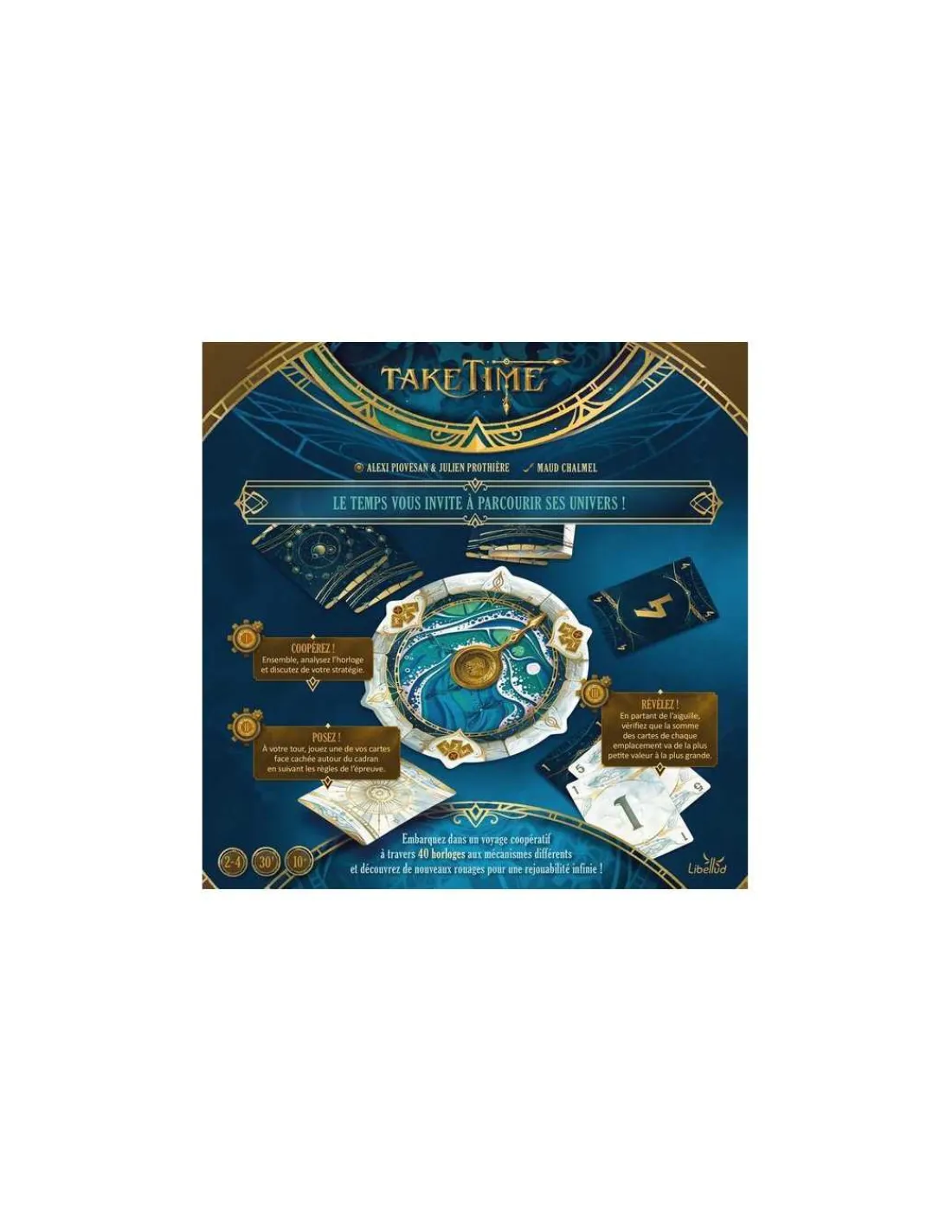 Découvrez le jeu Take Time de Libellud, un jeu de cartes coopératif accessible, immersif et rejouable, un jeu unique à communication limitée pour jouer de 2 à 4 joueurs, à partir de 10 ans. Un jeu de société qui vous plonge dans une aventure hors du commun, où chaque défi s’inscrit dans un univers graphique unique.