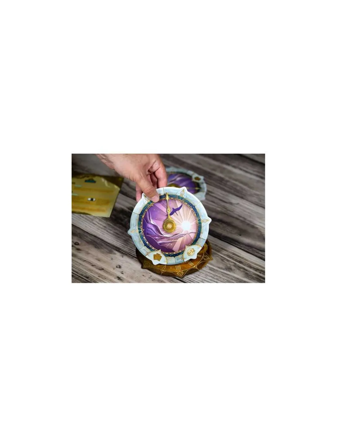 La boite de jeu contient 12 cartes Solaires (numérotées de 1 à 12), 12 cartes Lunaires (numérotées de 1 à 12), 3 jetons Rappel, 3 jetons Bonus, 10 étuis Chapitre contenant chacun 4 horloges et 1 feuille de règles, 1 aiguille, 1 étui Regrets (vide au début du jeu), 1 étui Renaissance contenant 1 horloge Renaissance, 1 aiguille des secondes et 6 jetons.