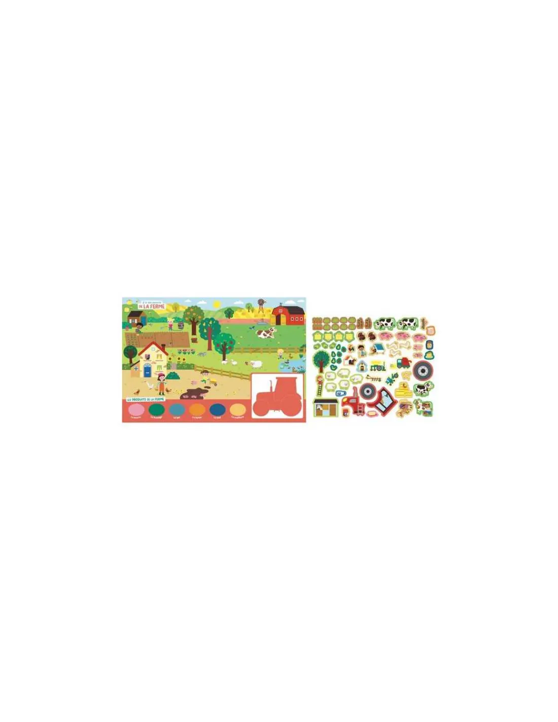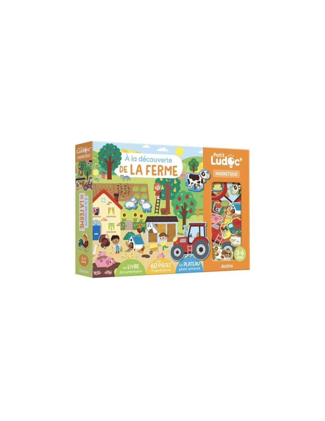 Ce coffret complet comprend un livre documentaire de 32 pages pour tout savoir sur la ferme, ainsi que + de 60 aimants à replacer sur un grand plateau aimanté.