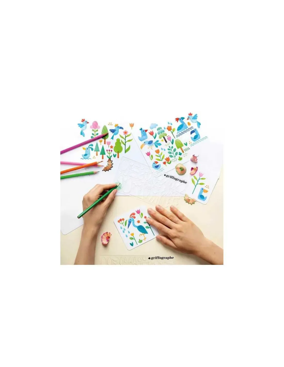 Le livre propose 2 griffographes (planche de pochoirs) qui permettent de combiner des formes à l’infini pour reproduire et imaginer de nombreux dessins. Cet outil artistique formidable et innovant s’accompagne de pages de modèles et de pas à pas pour s’entrainer.