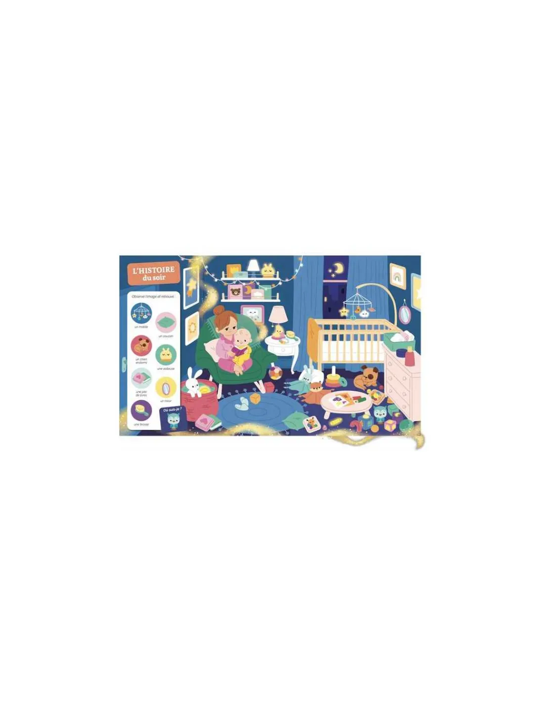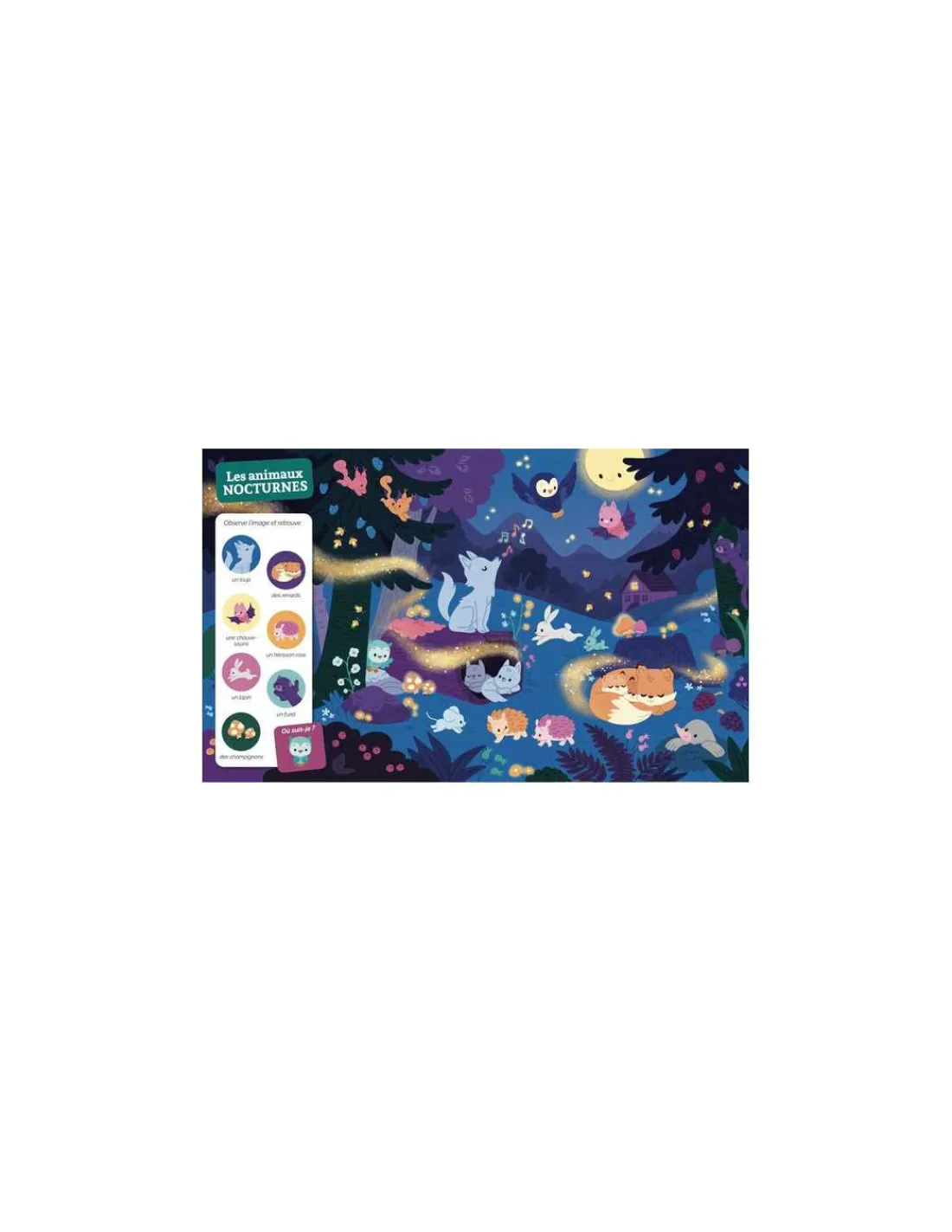 Ils observent attentivement et retrouvent 7 éléments (+ la mascotte) bien cachés sur chaque planche: des animaux endormis, des étoiles filantes, Peter Pan ou le marchand de sable apparaissent au fil des pages. Du vernis phosphorescent permet de retrouver des éléments cachés dans le noir !