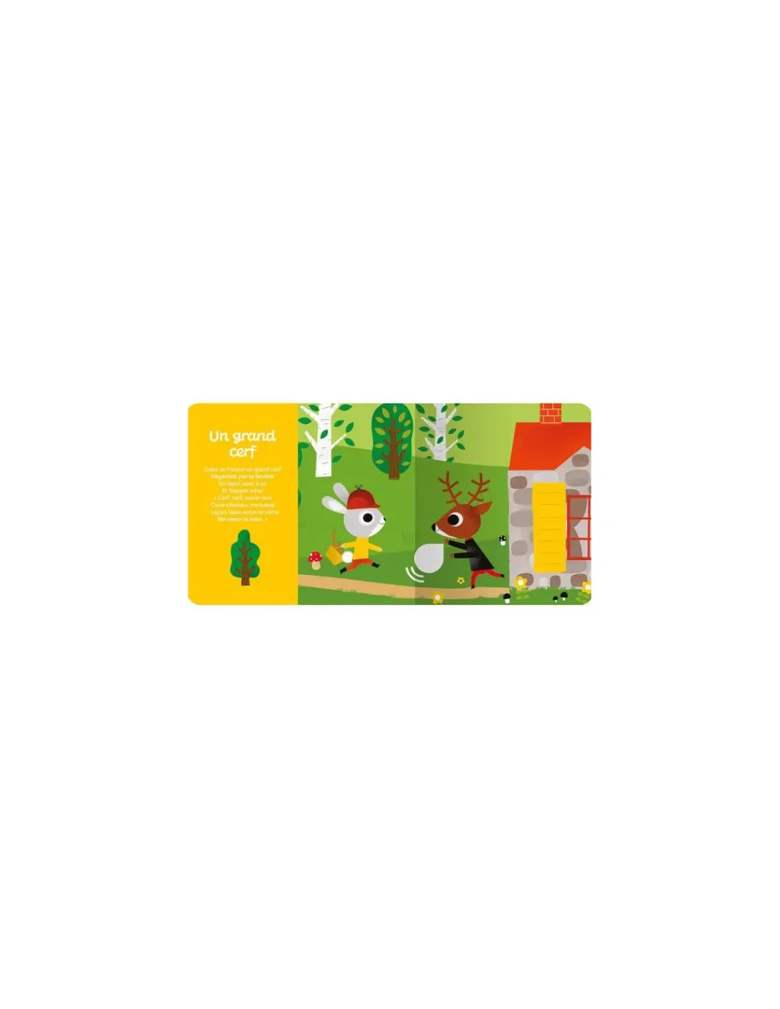 Un livre musical à mettre entre les mains des enfants en toute autonomie ou à partager joyeusement. En appuyant sur les puces sonores, votre enfant pourra écouter « Une souris verte », « Un grand cerf », « Coucou hibou », « Un éléphant qui se balançait », « promenons-nous dans les bois » et « Ah ! Les crocodiles ».