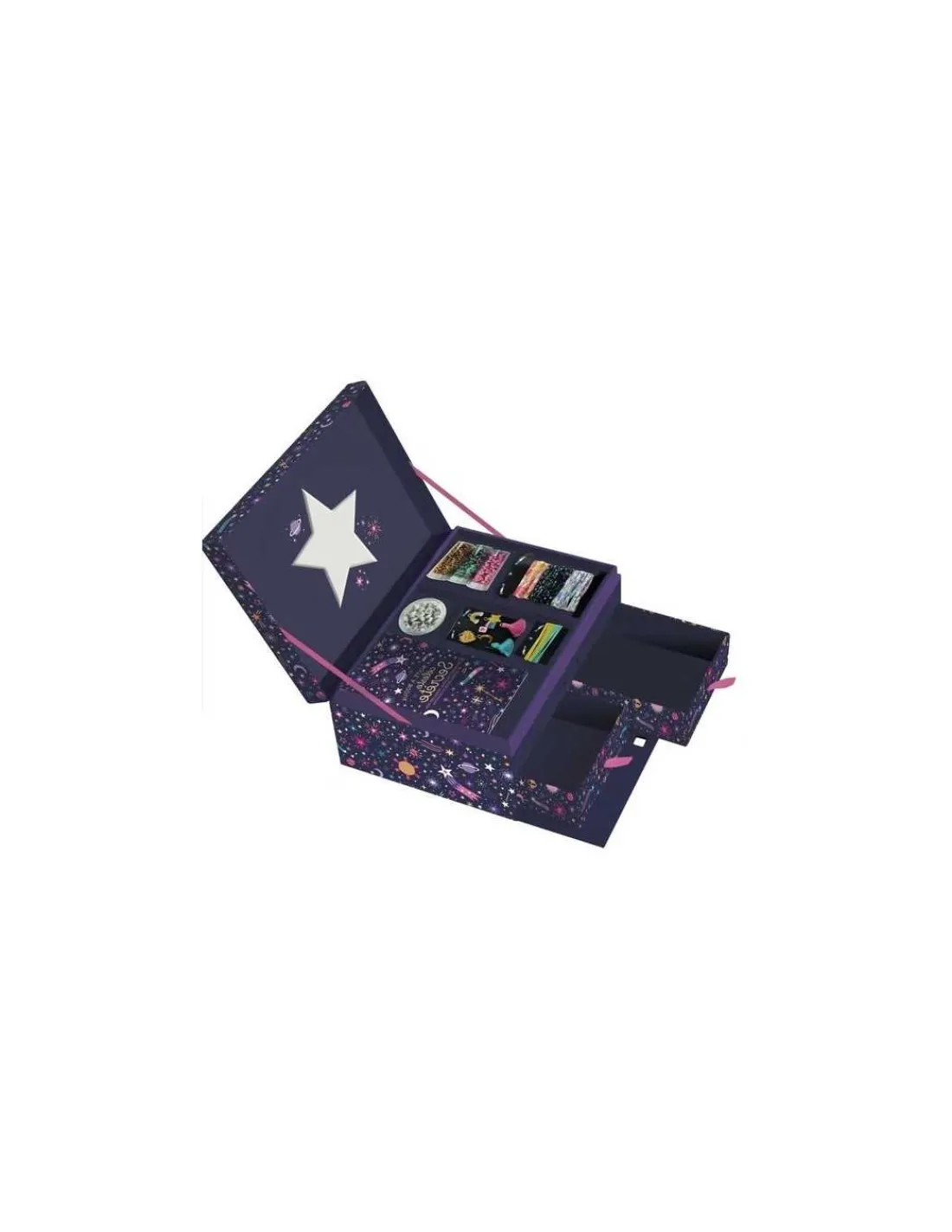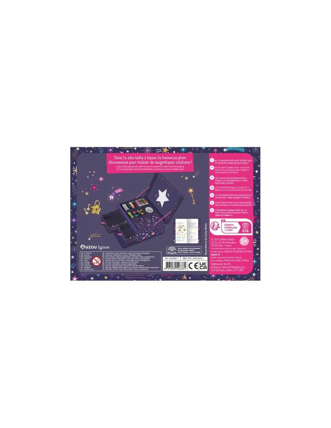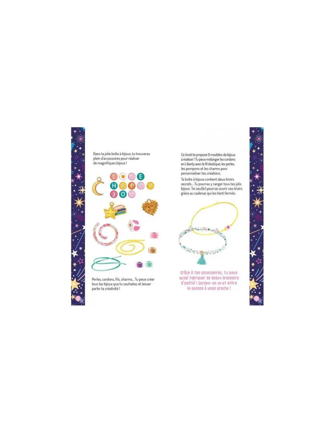 En ouvrant cette boîte joliment décorée, inspirée d’une douce nuit étoilée, les enfants trouveront une multitude d’accessoires pour confectionner de ravissantes créations. Parmi les trésors qu’elle renferme, on trouve des rubans en Liberty, des cordons néons, des perles de rocaille, des perles « Lettre », des charms, des pompons, un cadenas en forme d’étoile, ainsi qu’un livret explicatif pour guider les enfants dans leurs créations.