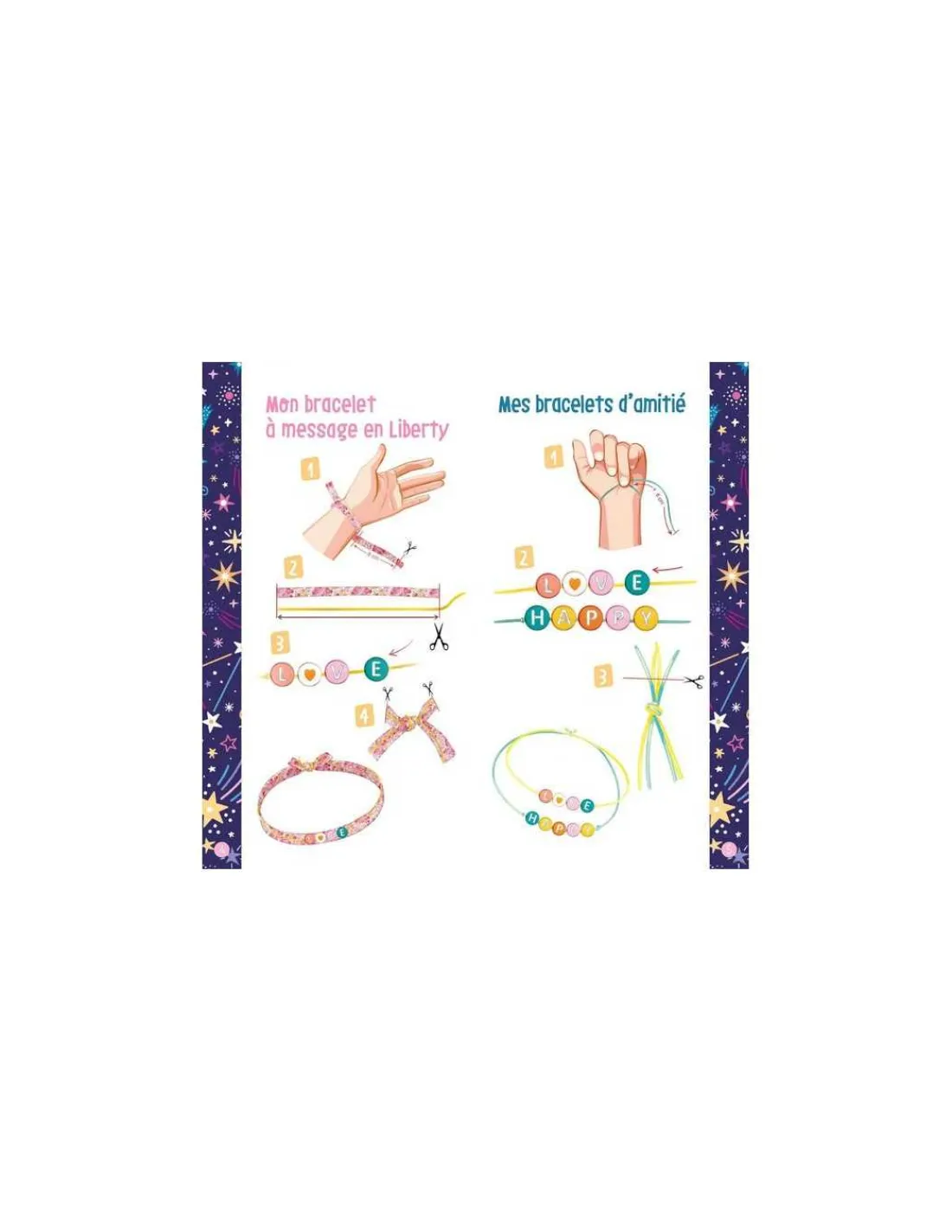 Le coffret comprend 3 rubans en Liberty, des cordons néons, 3 tubes de perles de rocaille, 1 boite de perles « Lettre », 3 charms, 2 pompons, un cadenas « Étoile » et un livret explicatif pas à pas.