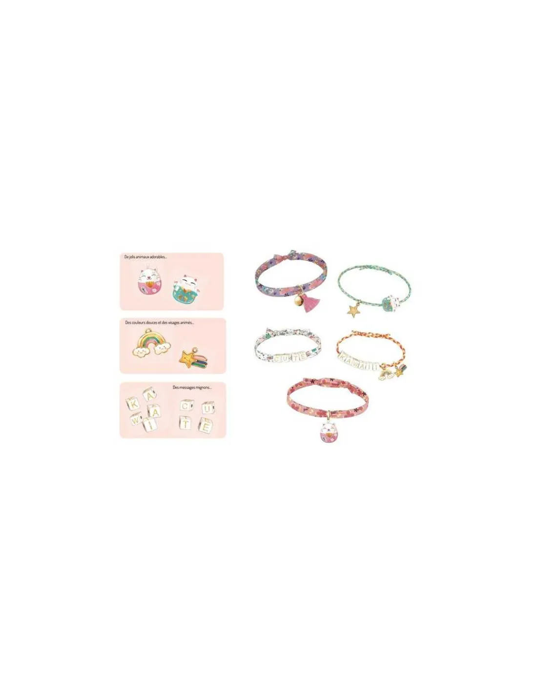 Ce coffret contient tout le nécessaire pour réaliser 8 magnifiques bracelets au style Kawaï : des perles uniques en forme de chats grelots, des perles en porcelaine inédites, des perles « Lettres » pour composer des mots ou des messages, des charms aux couleurs douces et aux visages animés…
