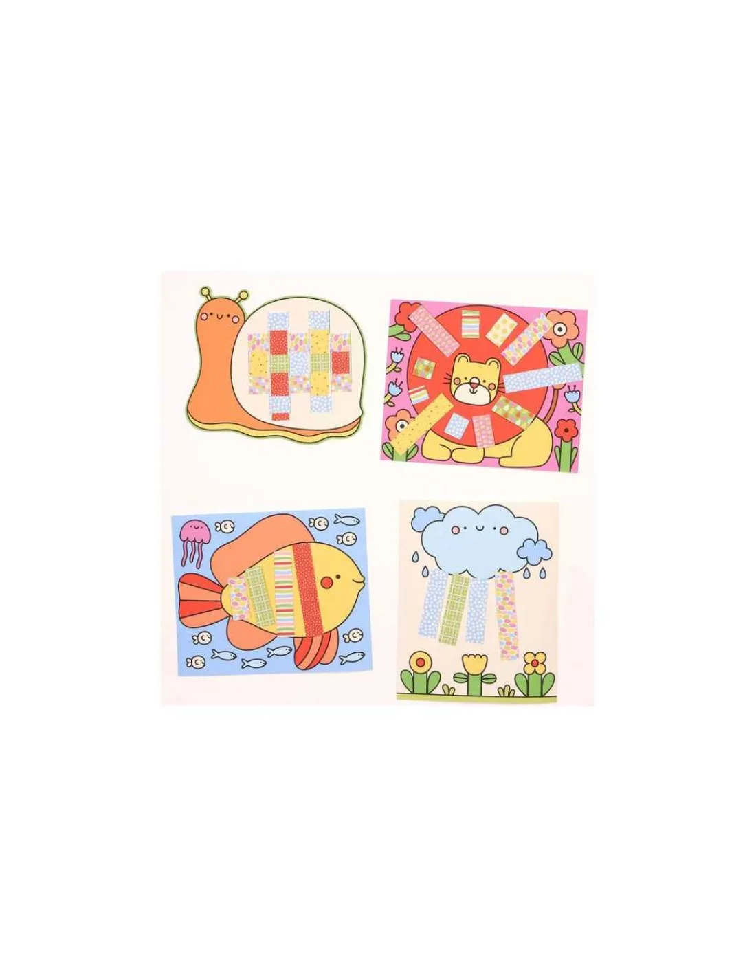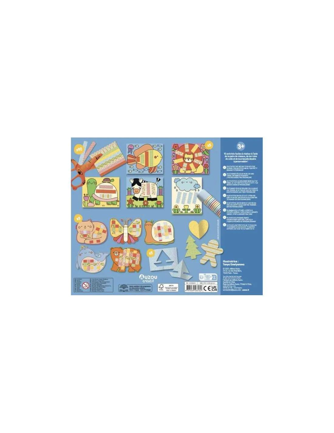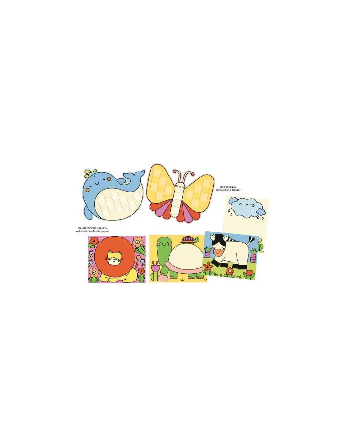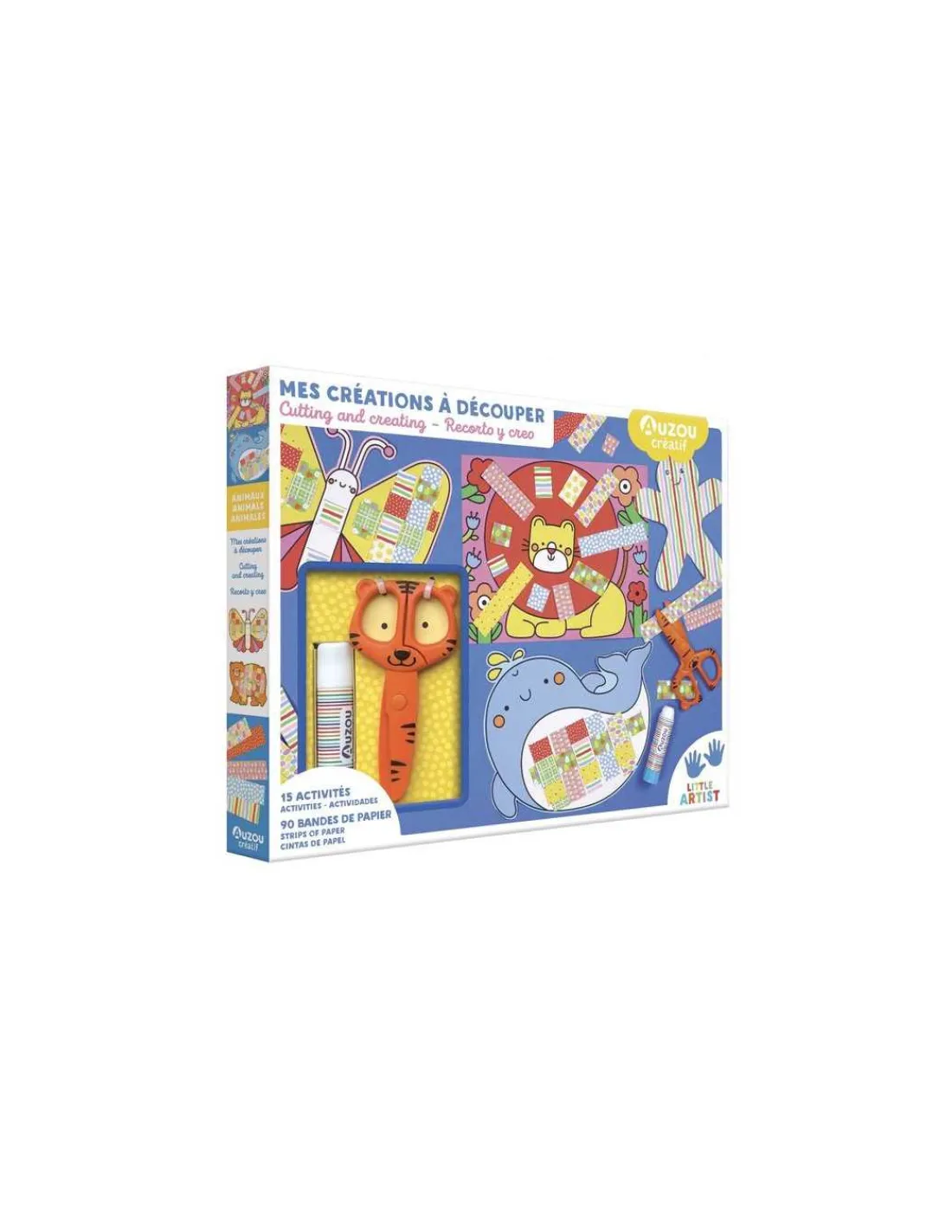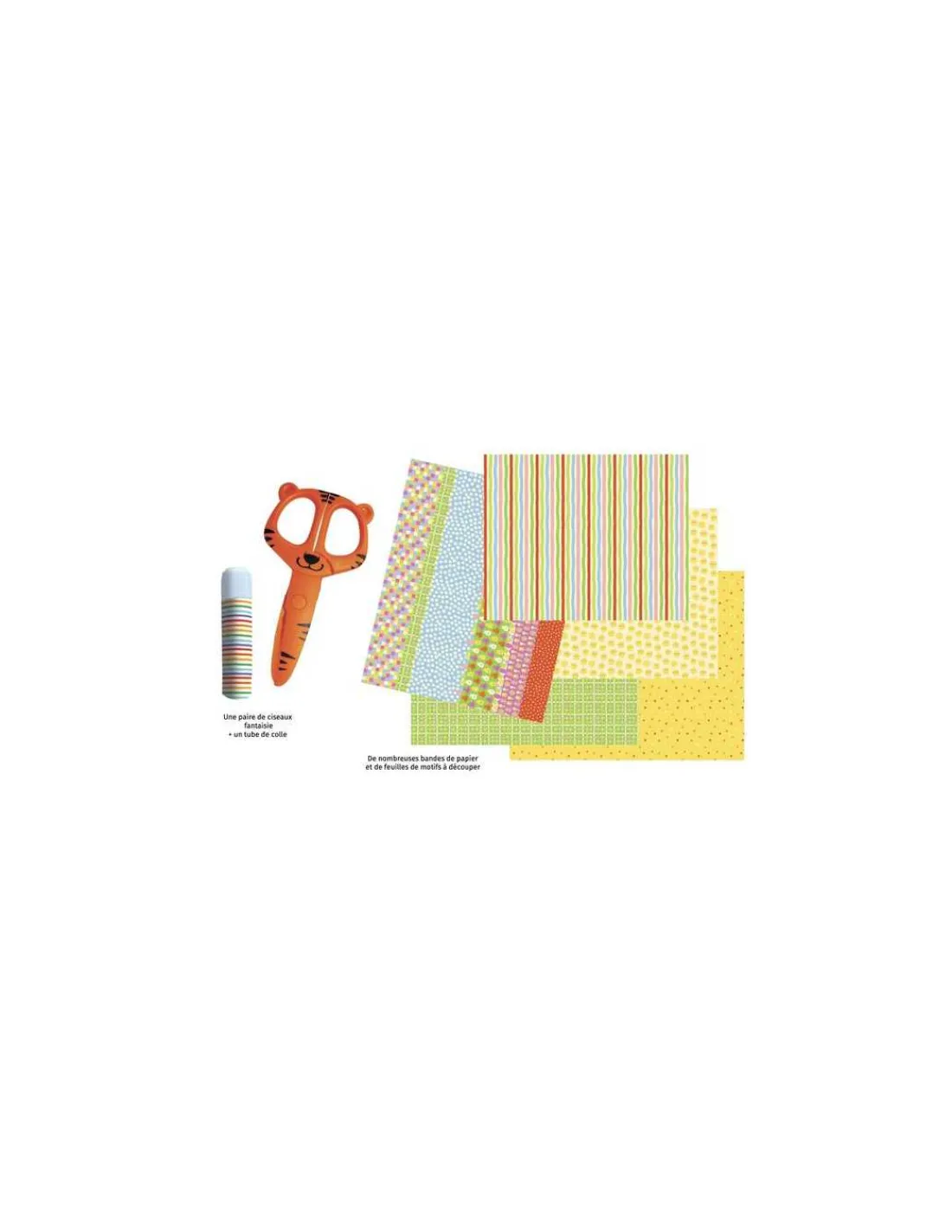 Ce coffret contient 15 activités faciles à réaliser pour les enfants à partir de 3 ans qui tournent autour du découpage : 90 bandes à découper et à coller, des animaux à tisser … Une paire de ciseaux fantaisie et un tube de colle sont fournis.