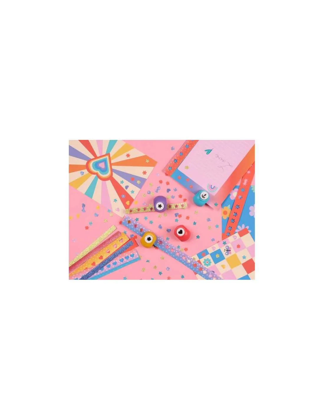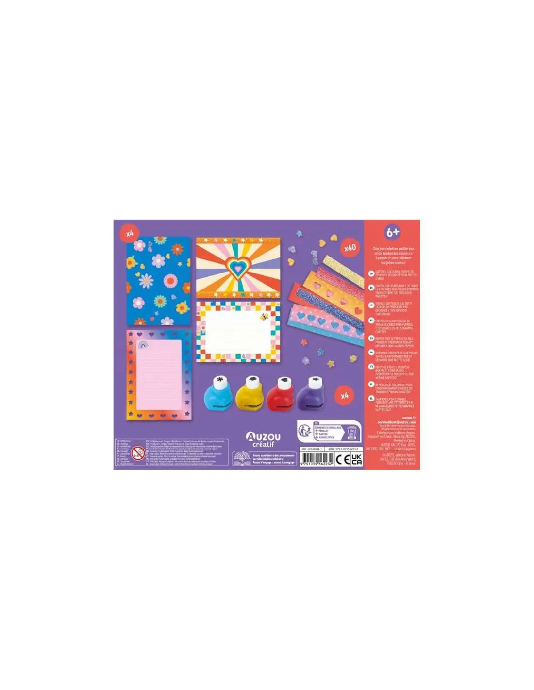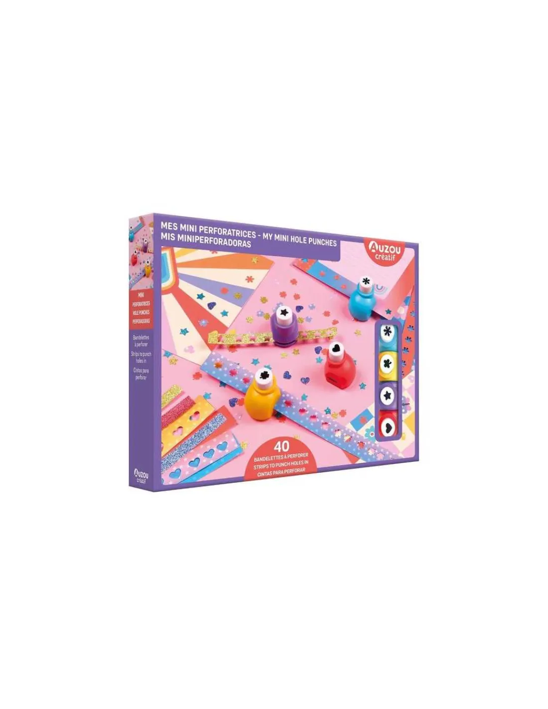 Le coffret contient 40 papiers de couleurs et pailletés à perforer, ainsi que 4 mini perforatrices fantaisie.