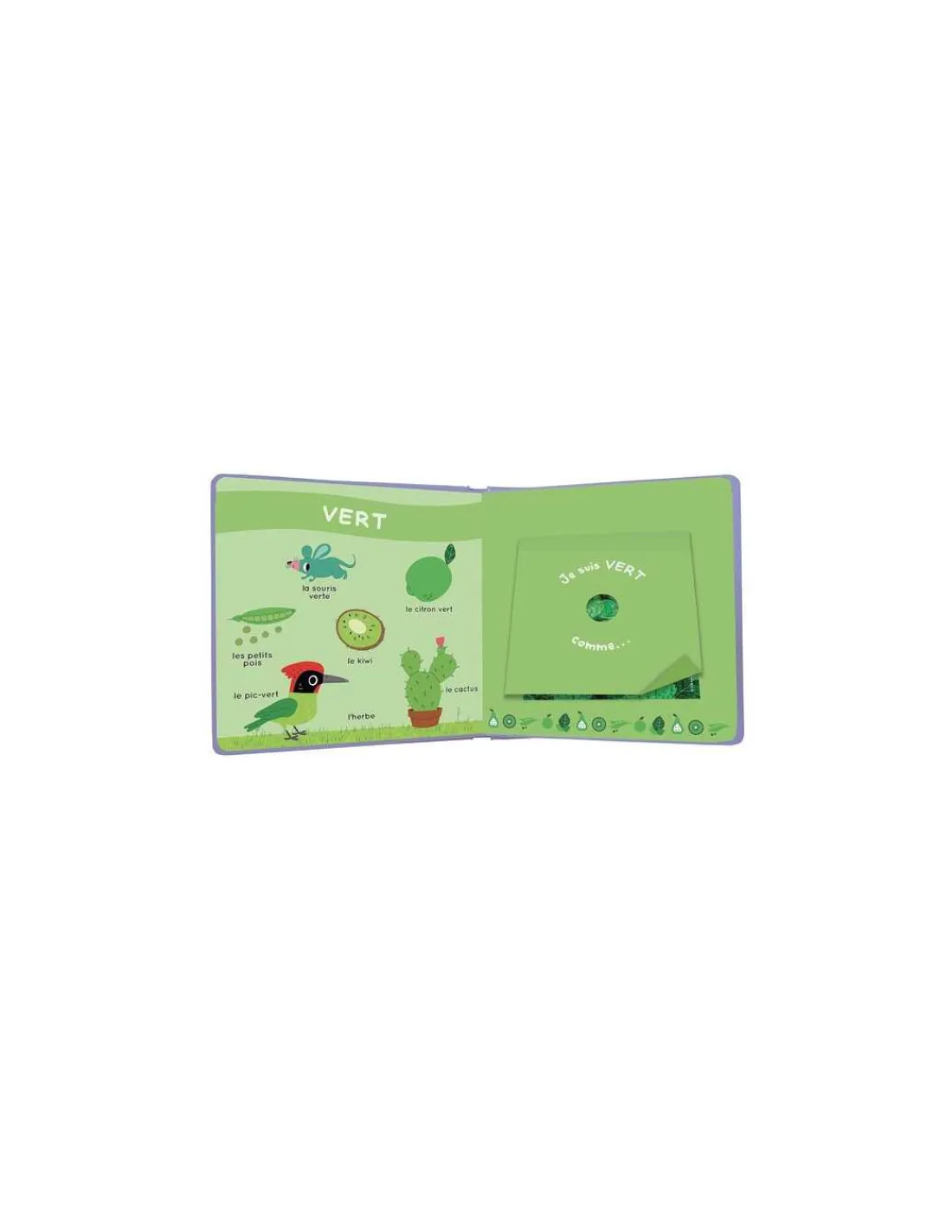 Chaque page de gauche présente une couleur grâce à de jolies illustrations simples et enfantines, mais que se cache-t-il derrière le rabat? En frottant son doigt, l’enfant y découvrira l’odeur du jardin de la couleur de la page. 7 parfums du jardin: Le lilas, Le jasmin, Le citron, La rose, La menthe et L’orange.