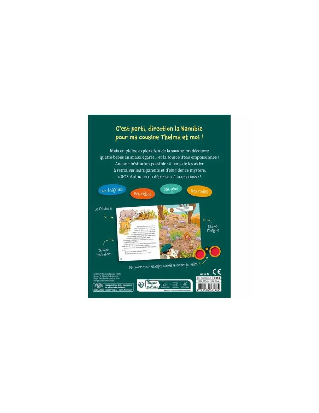 C’est parti, direction la Namibie pour ma cousine Thelma et moi ! Mais en pleine exploration de la savane, on découvre quatre bébés animaux égarés… et la source d’eau empoisonnée ! Aucune hésitation possible : à nous de les aider à retrouver leurs parents et d’élucider ce mystère. « SOS Animaux en détresse » à la rescousse !