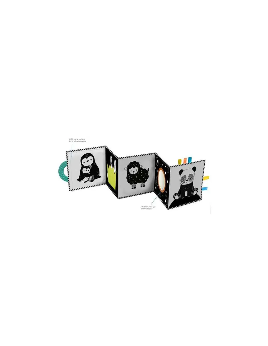 En format accordéon, ce livre en tissu propose différents éléments de manipulation pour un éveil tactile et moteur : un anneau de dentition, un grelot, des flaps en feutrine, des rubans à attraper et un incontournable : le miroir. Un cadeau de naissance idéal !