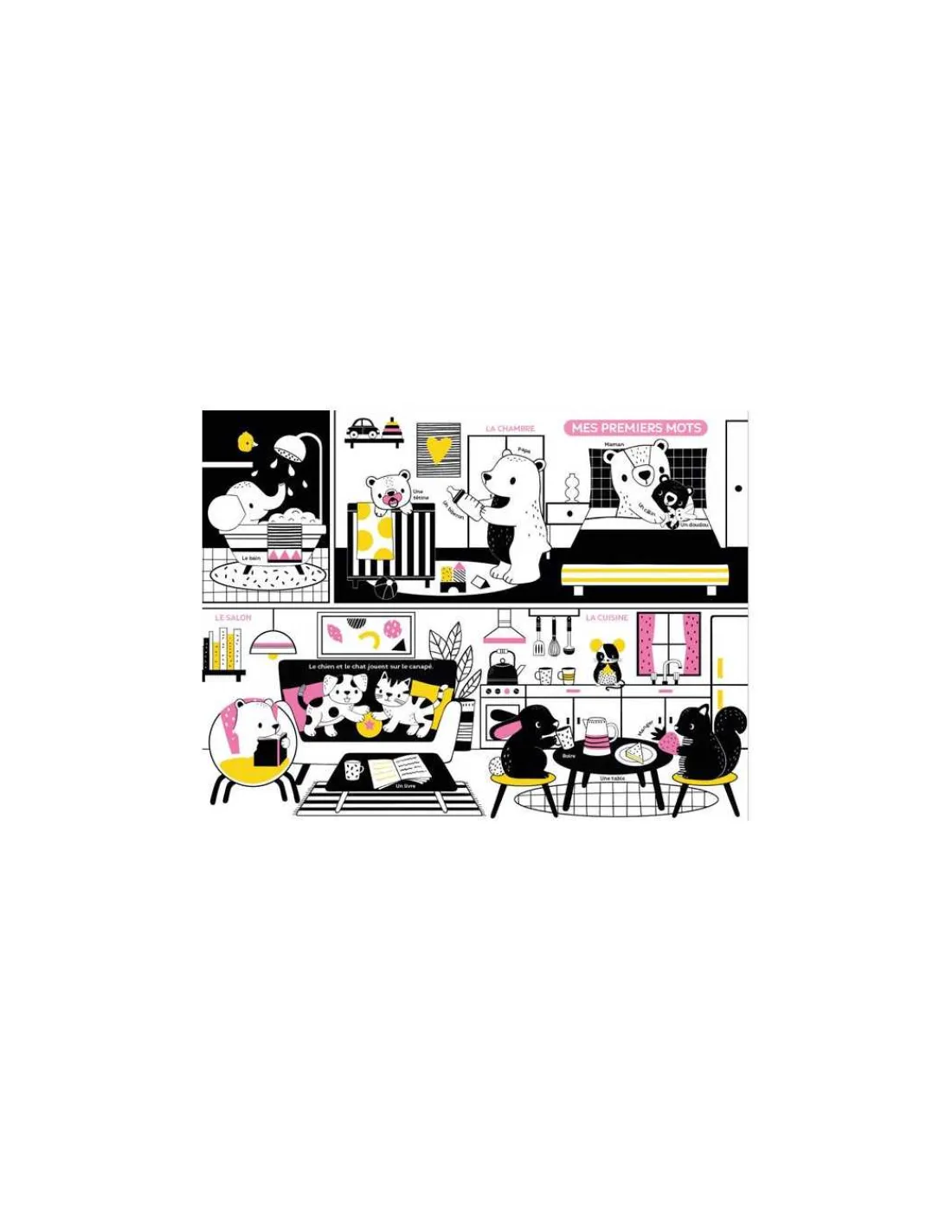 Un magnifique livre au format géant avec plus de 20 matières à toucher au fil des pages et qui peut se transformer en tapis d’éveil. Le tout-petit découvre même un miroir à la fin ! Ce nouveau titre revêt un magnifique design en noir et blanc, avec des touches de couleurs flashy avec 4 tableaux magnifiques à observer !
