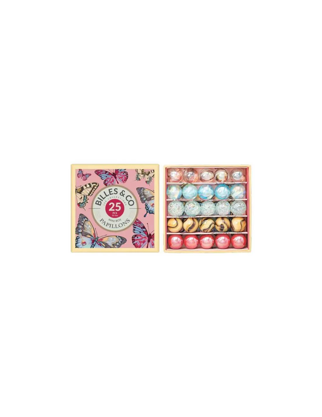 Découvrez le coffret de 25 billes Papillons Anamorphique de Billes & Co, de magnifiques billes présentées dans un splendide coffret cadeau pour une expérience magique. Billes & Co met en valeur ces petites boules de verre avec lesquelles tous les enfants ont joué, afin d’en faire des “trésors de pierres précieuses”.