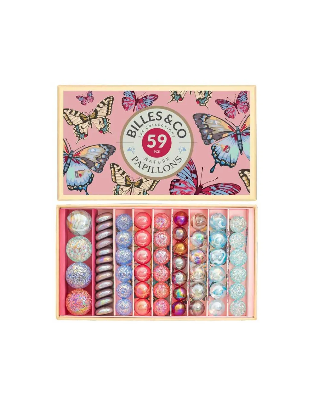 Découvrez le coffret de 59 billes Papillons Anamorphique de Billes & Co. Billes et calots dans un splendide coffret cadeau pour une expérience magique. Billes & Co met en valeur ces petites boules de verre avec lesquelles tous les enfants ont joué afin d’en faire des “trésors de pierres précieuses”.