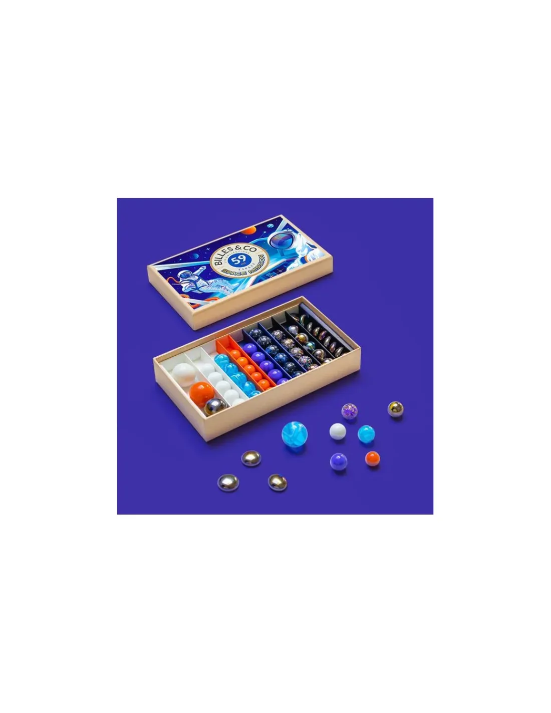 Découvrez le coffret de 59 billes Space mission de Billes & Co. Billes, calots et galets dans un splendide coffret cadeau. Billes & Co met en valeur ces petites boules de verre avec lesquelles tous les enfants ont joué afin d’en faire des “trésors de pierres précieuses”.