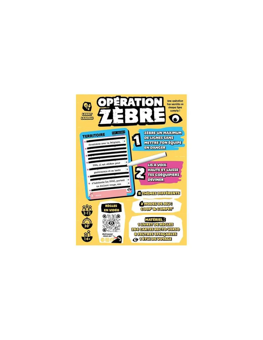 Découvrez le jeu Opération Zèbre de Big Moustache Games, un jeu de culture générale original pour jouer de 2 à 12 joueurs, à partir de 14 ans.