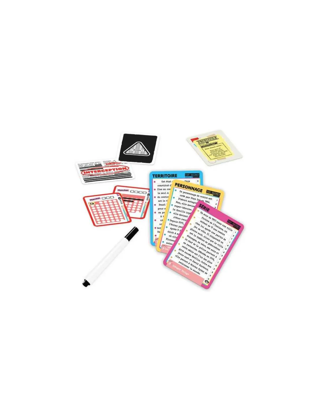Essayez de faire deviner le contenu de votre document classifié en dissimulant certaines informations. Pour cela, rayer les éléments inutiles sur votre carte et lisez à haute voix ce qui reste. Veillez cependant à ne pas trop simplifier les indices : il est important de fournir suffisamment de détails pour que vos coéquipiers puissent deviner avec précision. Le vrai défi consiste à trouver le juste milieu entre l’occultation d’informations et la préservation d’indices clairs pour mener votre équipe à la bonne réponse!