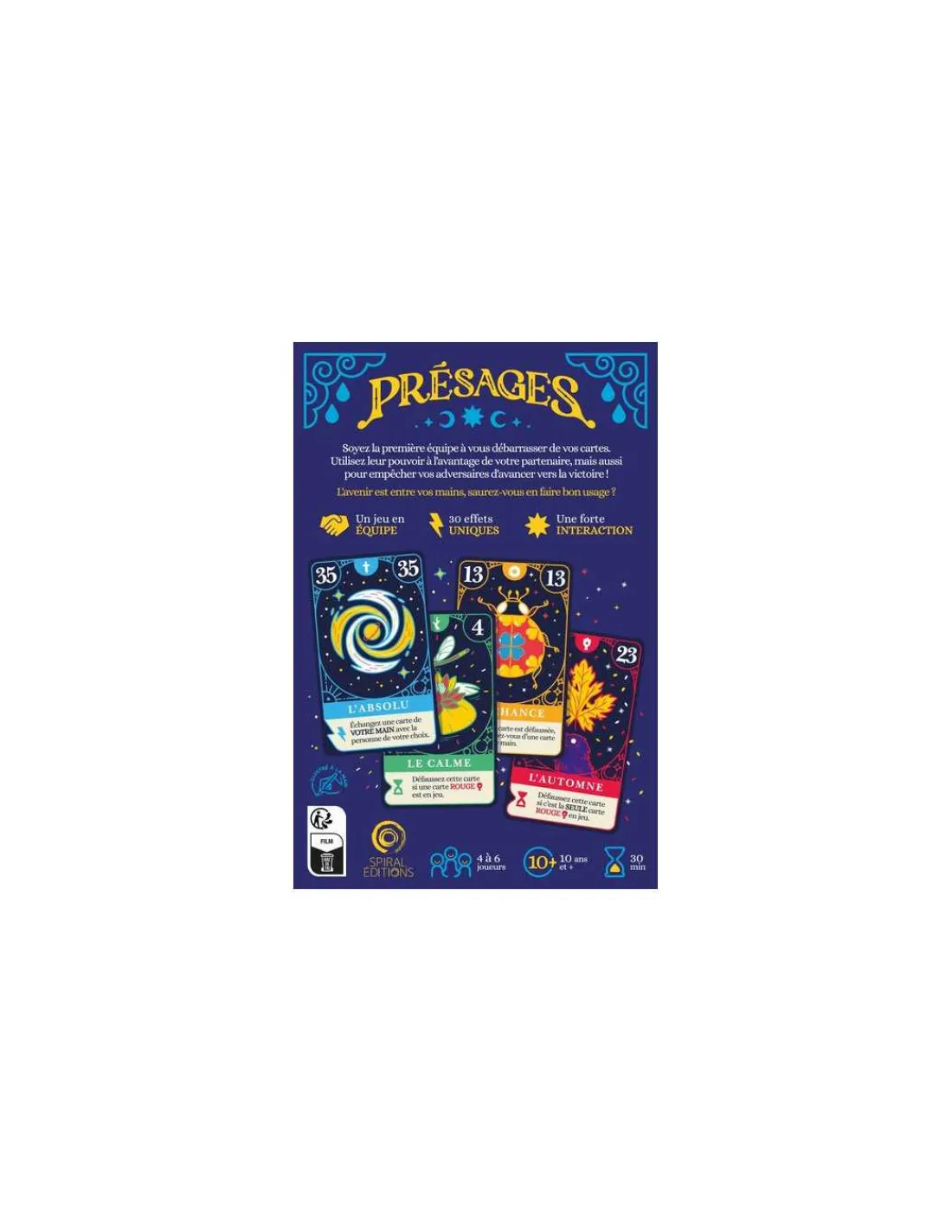 Découvrez le jeu Présages de Spiral Éditions, un jeu de défausse qui se joue en équipe et où chaque décision compte. Un jeu d’affrontement fort en émotions et en rebondissements pour jouer de 4 à 6 joueurs à partir de 10 ans.