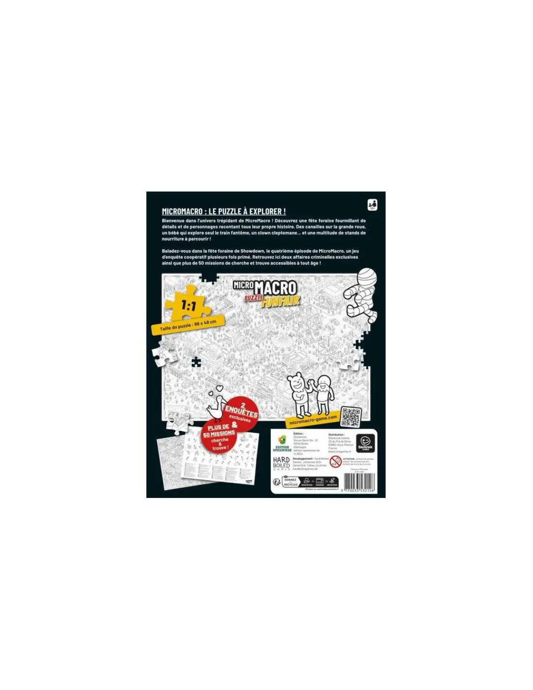 Bienvenue dans l’univers trépidant de MicroMacro! Découvrez une fête foraine fourmillant de détails et de personnages racontant tous leur propre histoire. Des canailles sur la grande roue, un bébé qui explore seul le train fantôme, un clown cleptomane… et une multitude de stands de nourriture à parcourir! Réalisez le puzzle afin de reconstituer le plan de la fête foraine. C’est dans les illustrations de ce puzzle que vous chercherez la solution des différentes étapes de l’enquête.