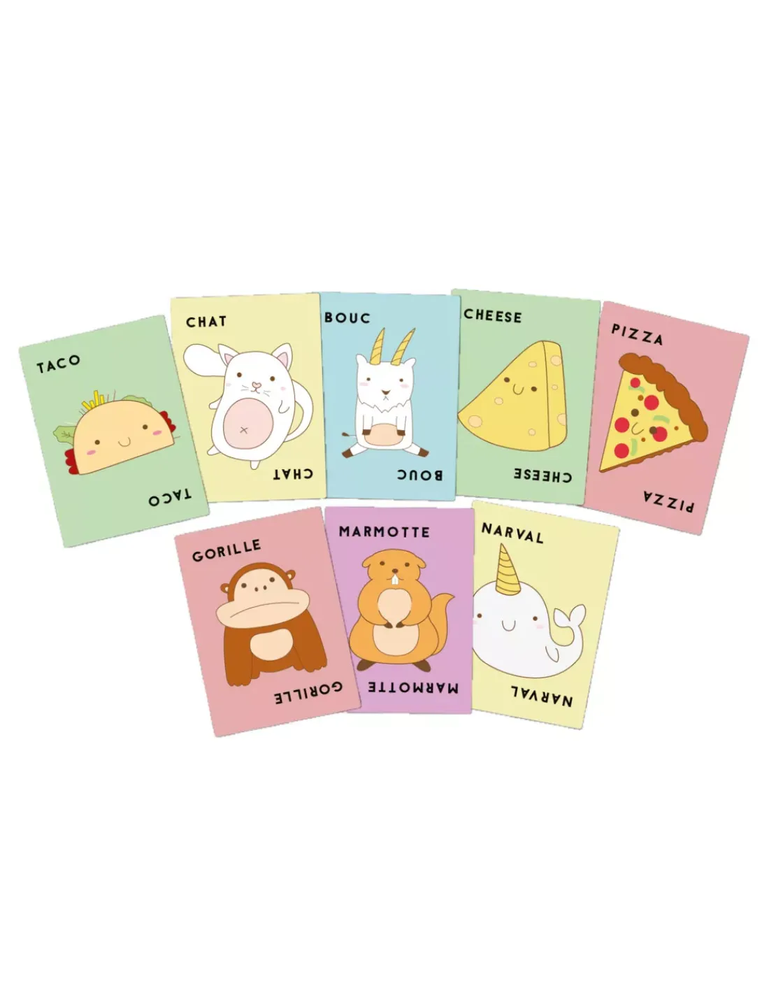 Taco Chat Bouc Cheese Pizza ! Taco Chat Bouc Cheese Pizza! Gardez bien ces 5 mots loufoques en tête. Dès qu’une carte correspondant au mot annoncé est révélée, tapez la pile centrale. Le dernier ramasse tout ! Soyez observateurs et vifs pour vous débarrasser de toutes vos cartes! La moindre erreur vous coûtera des cartes de pénalité : ni feinte, ni approximation dans ce jeu de défausse complètement frénétique et farfelu.