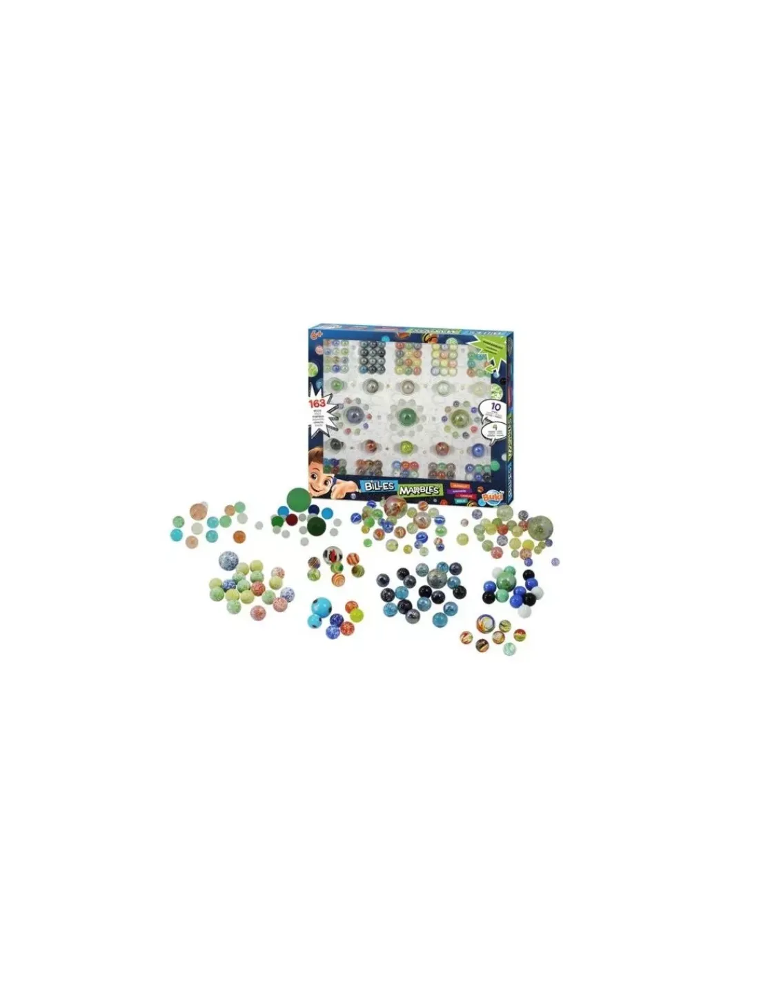 Découvrez le coffret de 163 billes de Buki, un coffret de 163 billes en verre de 4 tailles et 12 styles différents.
