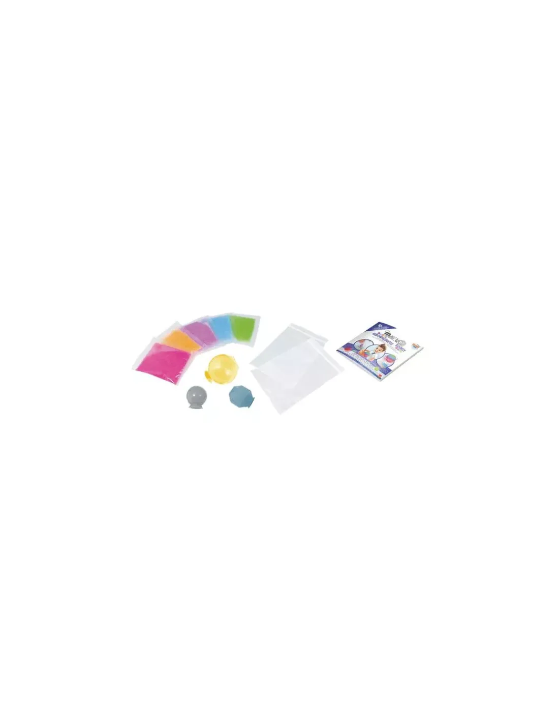 La boite contient 5 poudres dont 1 phosphorescente, 3 moules et des sachets de conservation et la notice illustrée en couleurs.
