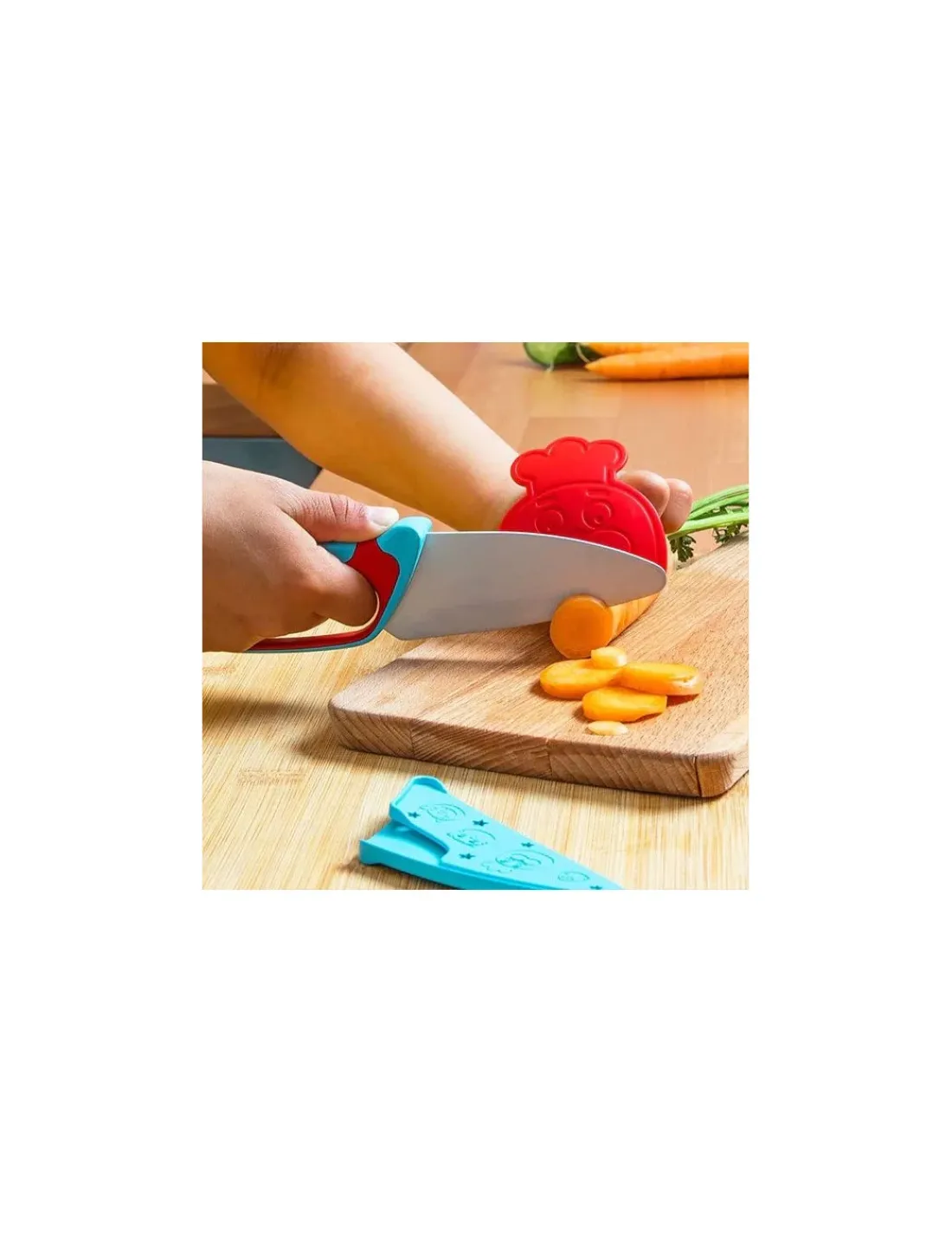 Découvrez le couteau du chef bleu et rouge de Chefclub Kids, un coffret comprenant un couteau adapté à la taille des mains des enfants, un protège lame et un protège doigts à l’effigie des personnages Chefclub.