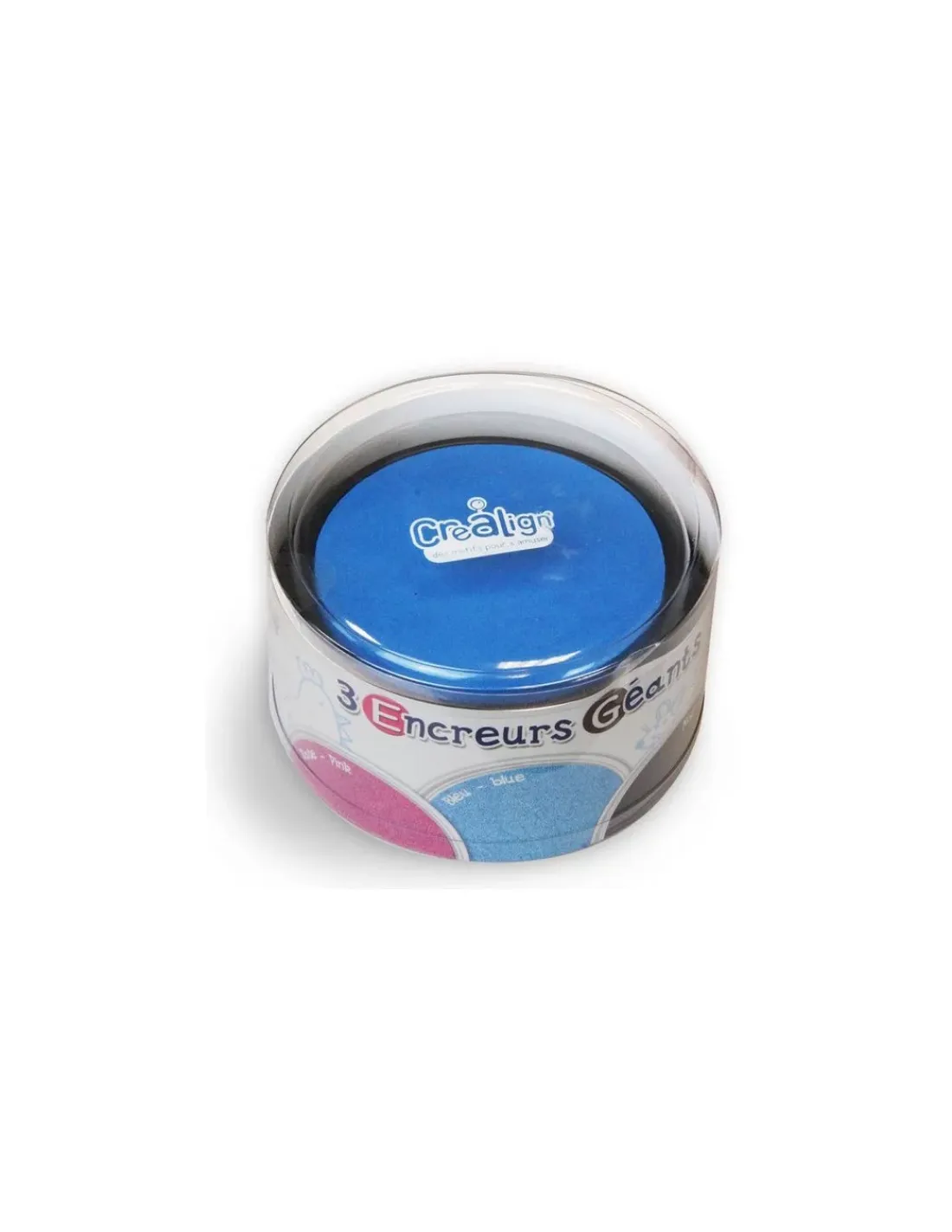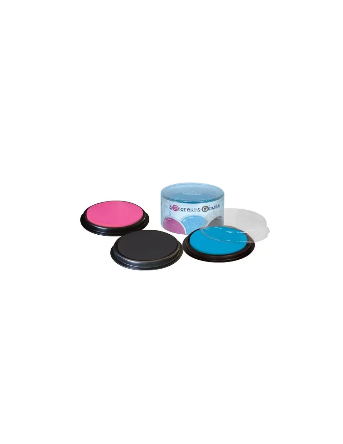 Découvrez la boite de 3 encreurs géants ronds bleu rose noir de Créalign’, 3 gros encreurs pour accueillir des tampons de différentes tailles.