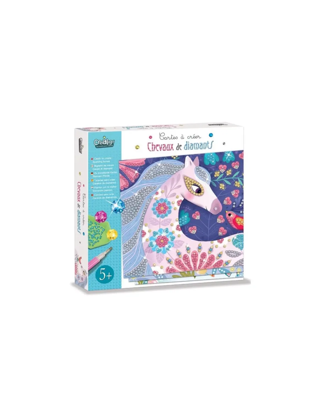 Découvrez le coffret Cartes à créer Chevaux de diamants de Créalign’, une activité créative pour les enfants à partir de 5 ans avec des strass sur le thème des chevaux.