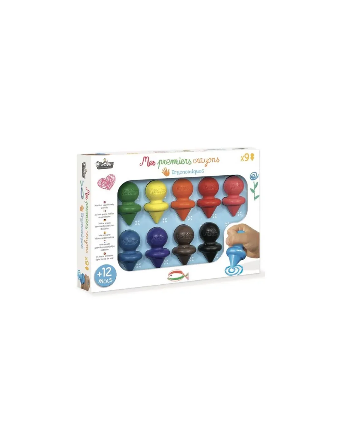 Découvrez le coffret Mes 9 premiers crayons de Créalign’, 9 crayons de cire ergonomiques et lavables pour les enfants à partir de 1 an.