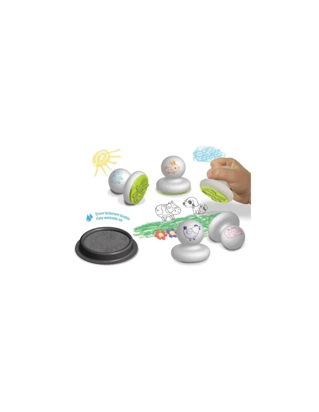 Le coffret contient 5 tampons et un encreur noir maxi format lavable à l’eau.