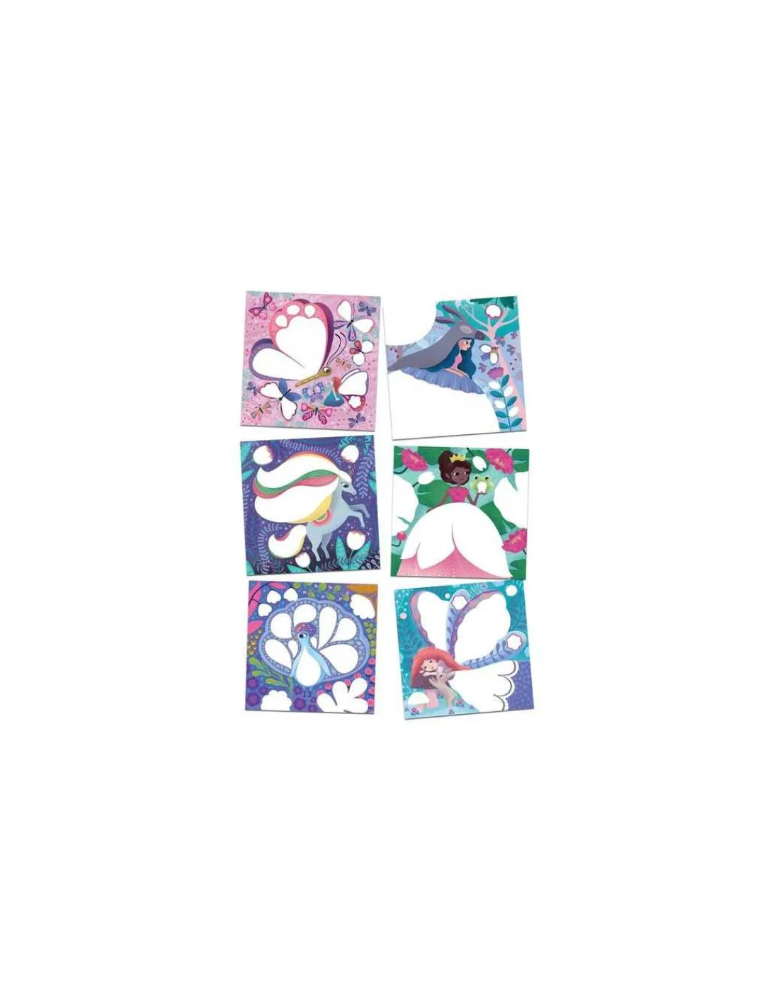 Les jeunes artistes ne déborderont pas des zones à remplir grâce aux masques intégrés. Princesse, fée, licorne, paon… se pareront de jolies empreintes de doigts colorées.