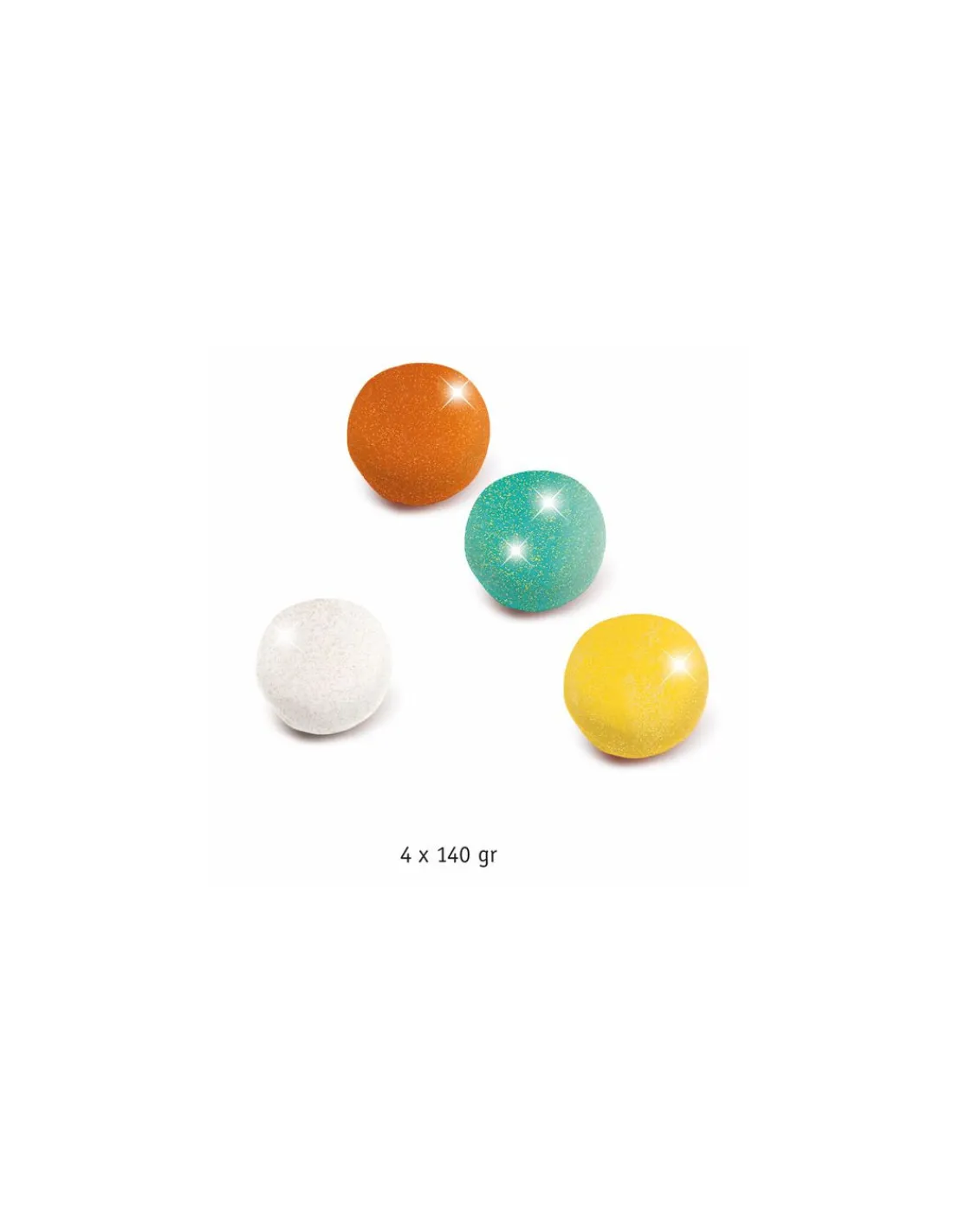 Ce set se compose de 4 pots de pâte à modeler ( pot de 140 grammes) de couleur blanc, orange, vert et jaune avec des paillettes.