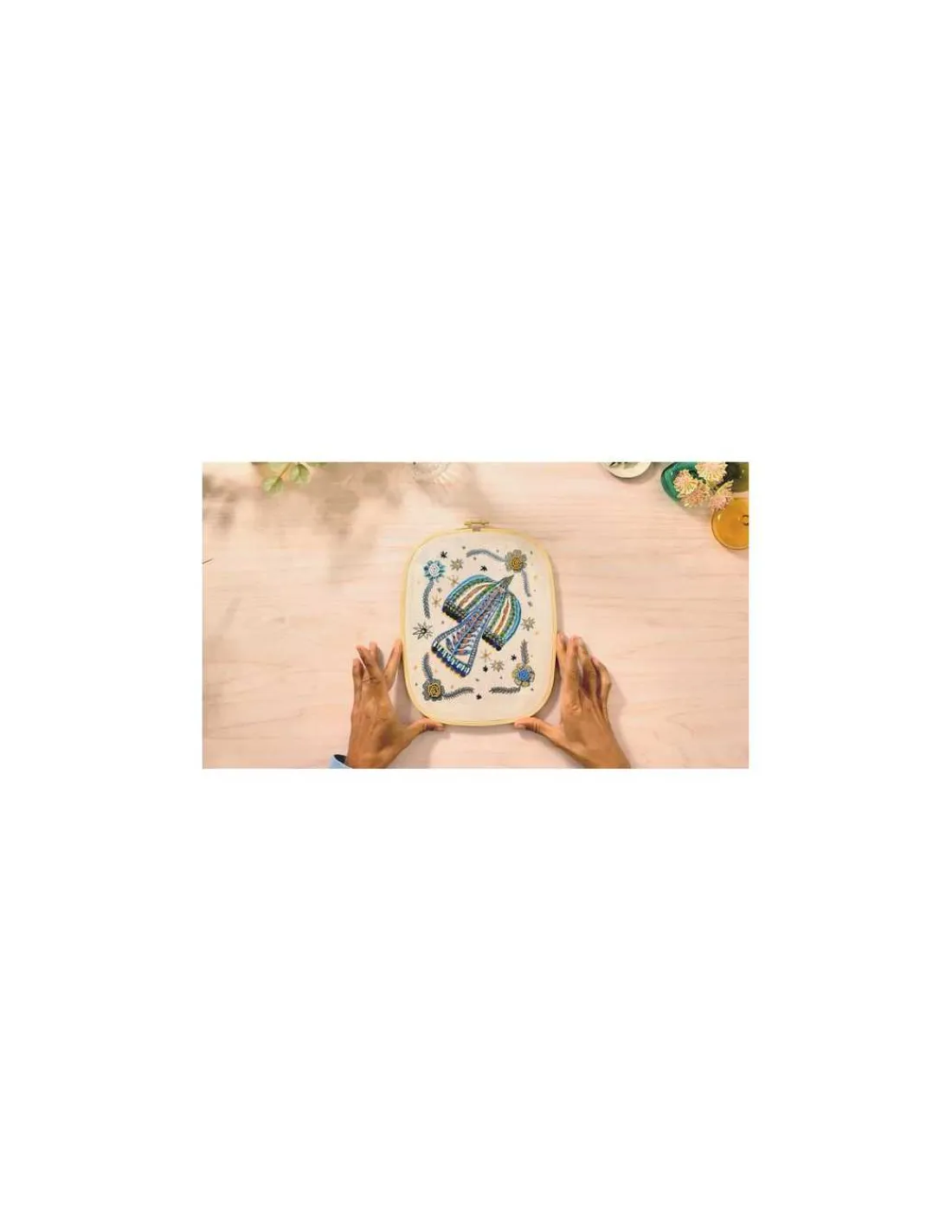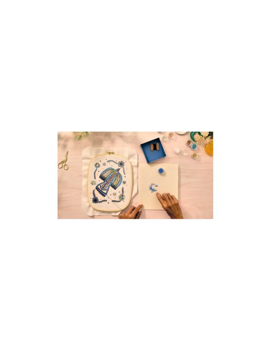 Ce coffret comprend 1 tambour de broderie en bois, 1 toile imprimée, 1 paire de ciseaux de broderie, 9 boîtes de perles et sequins, 1 tapis d’enfilage, 2 aiguilles, 1 passe-fil, 2 bobines de fil bleu, 1 modèle à suivre, un dépliant et une carte avec QR code menant à une vidéo tuto pour découvrir l’activité.