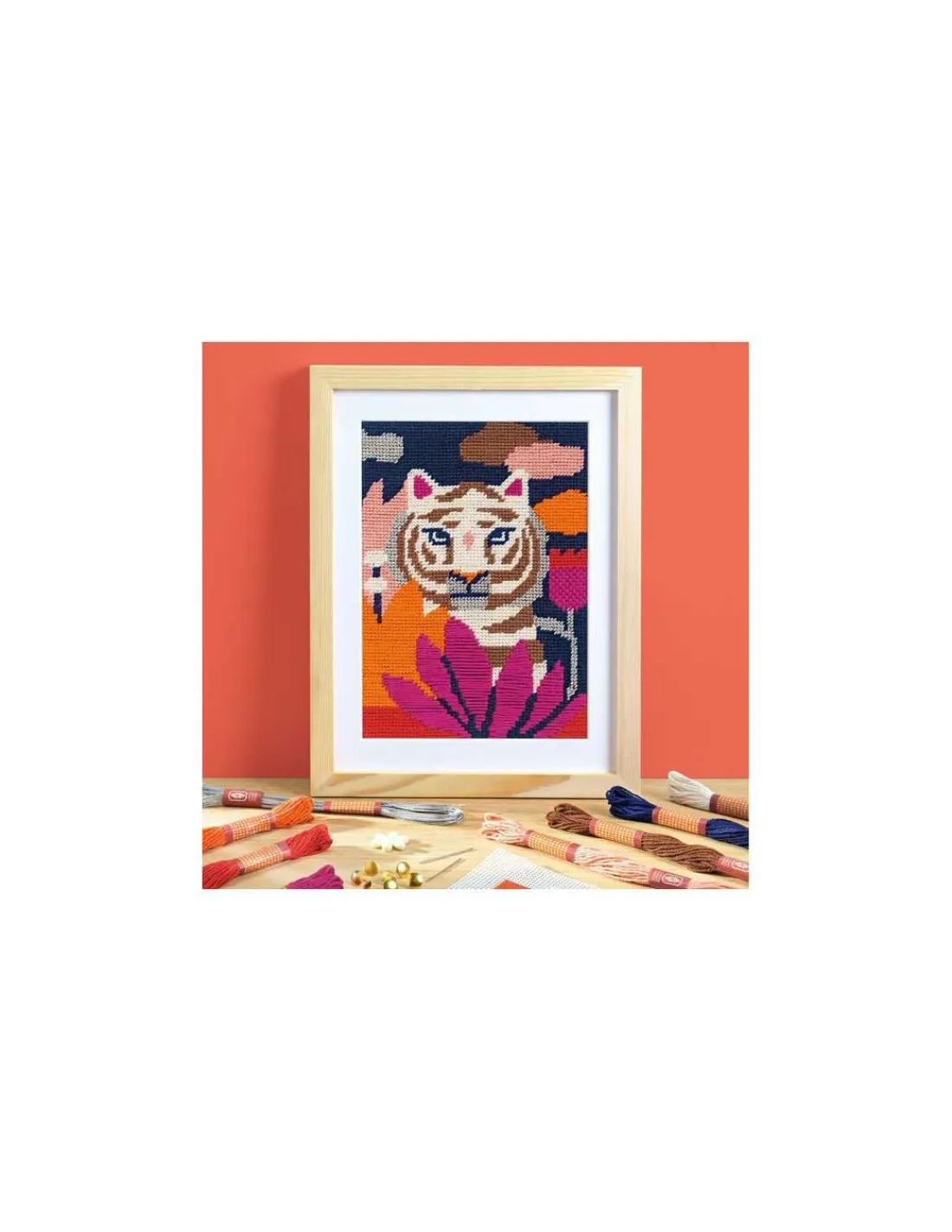 Ce coffret comprend 1 toile à canevas imprimée en couleurs, 9 x 15 mètres de fils de couleurs, 2 aiguilles, 1 passe-fil, 1 paire de ciseaux de broderie, 8 punaises, 1 cadre en bois, 1 modèle à suivre, un dépliant et une carte avec QR code menant à une vidéo tuto pour découvrir l’activité.
