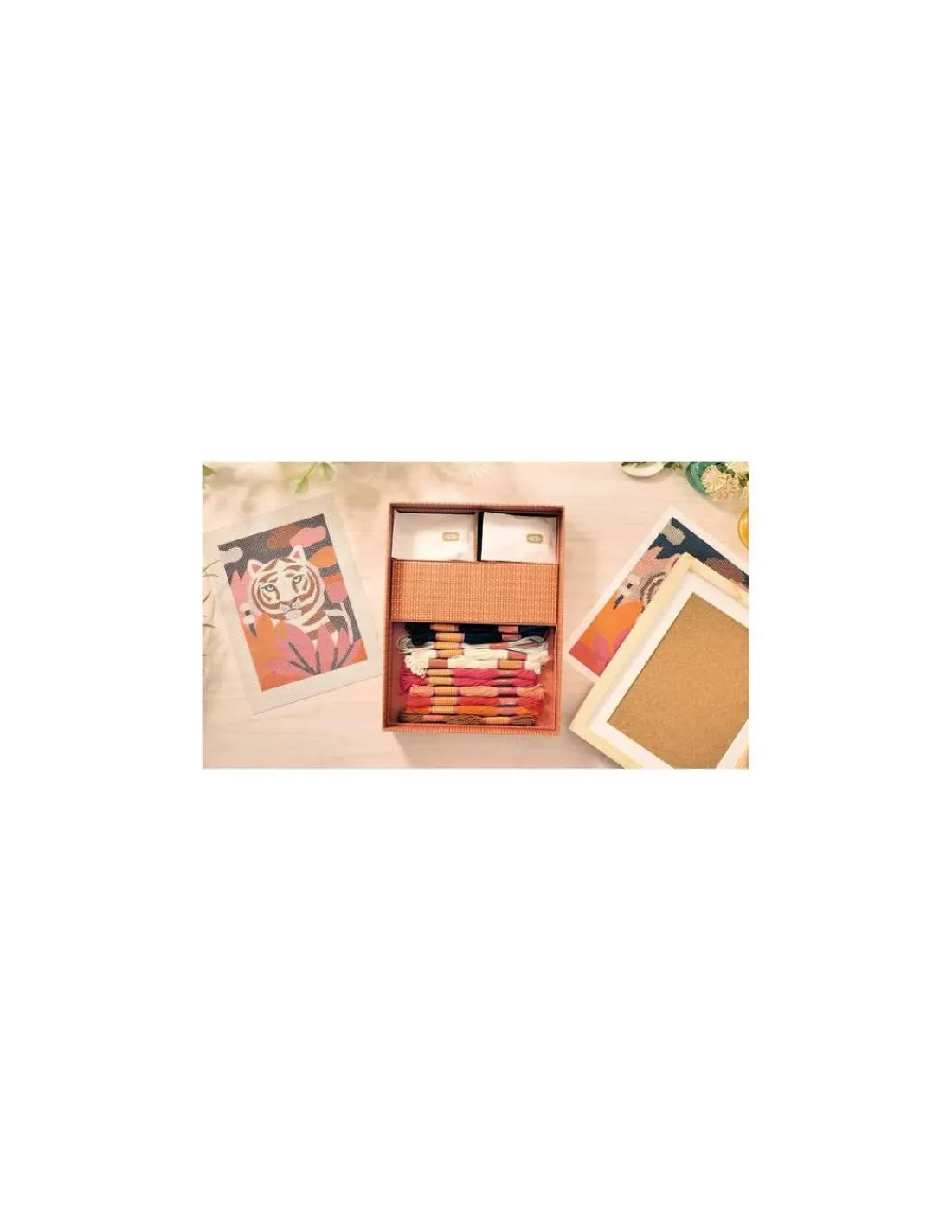 Un coffret complet avec tout le matériel nécessaire avec un cadre en bois inclus pour exposer fièrement sa création, dans une jolie boîte décorée, pour mettre de côté son activité entre deux moments de création, puis la transformer en boîte à trésors.