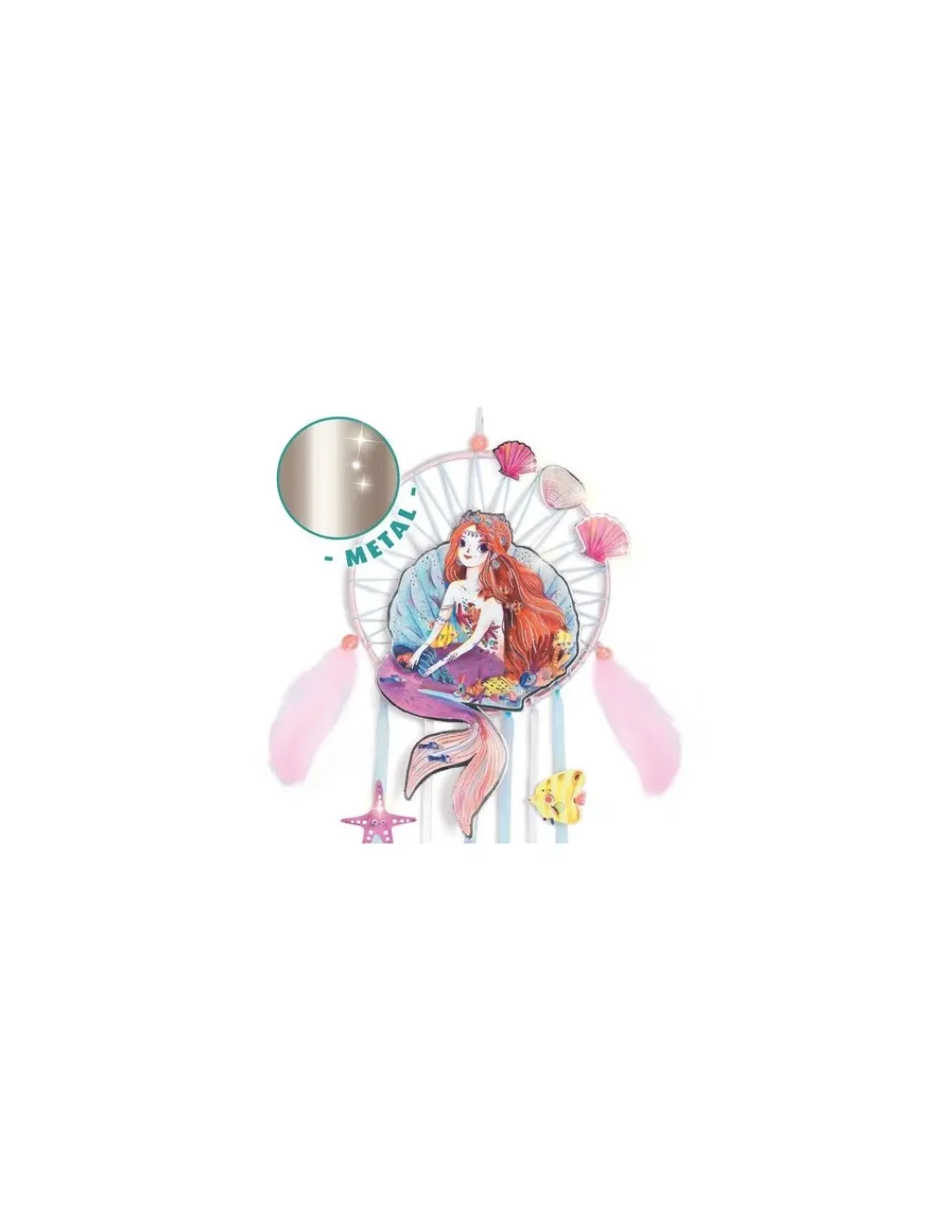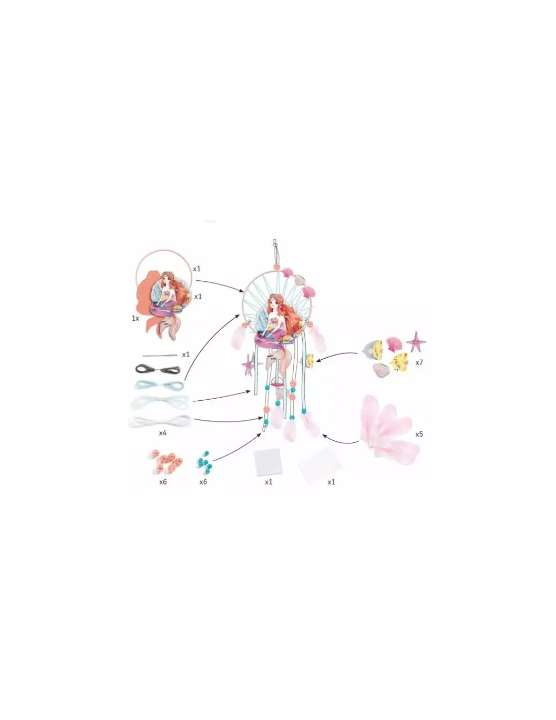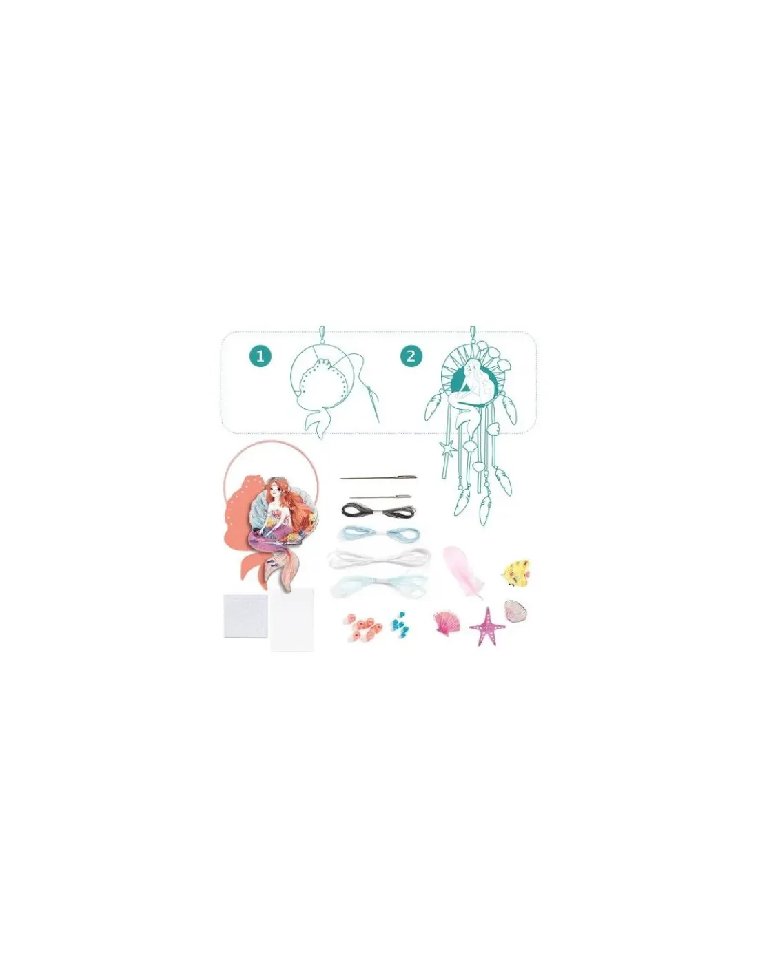Pour faciliter la création de l’attrape-rêve, le cercle est livré enrubanné et une aiguille à broder est fournie pour l’étape de tissage. Pas à pas, votre enfant va réaliser un superbe attrape-rêve orné d’une douce sirène qui décorera sa chambre et la protégera des mauvais rêves.
