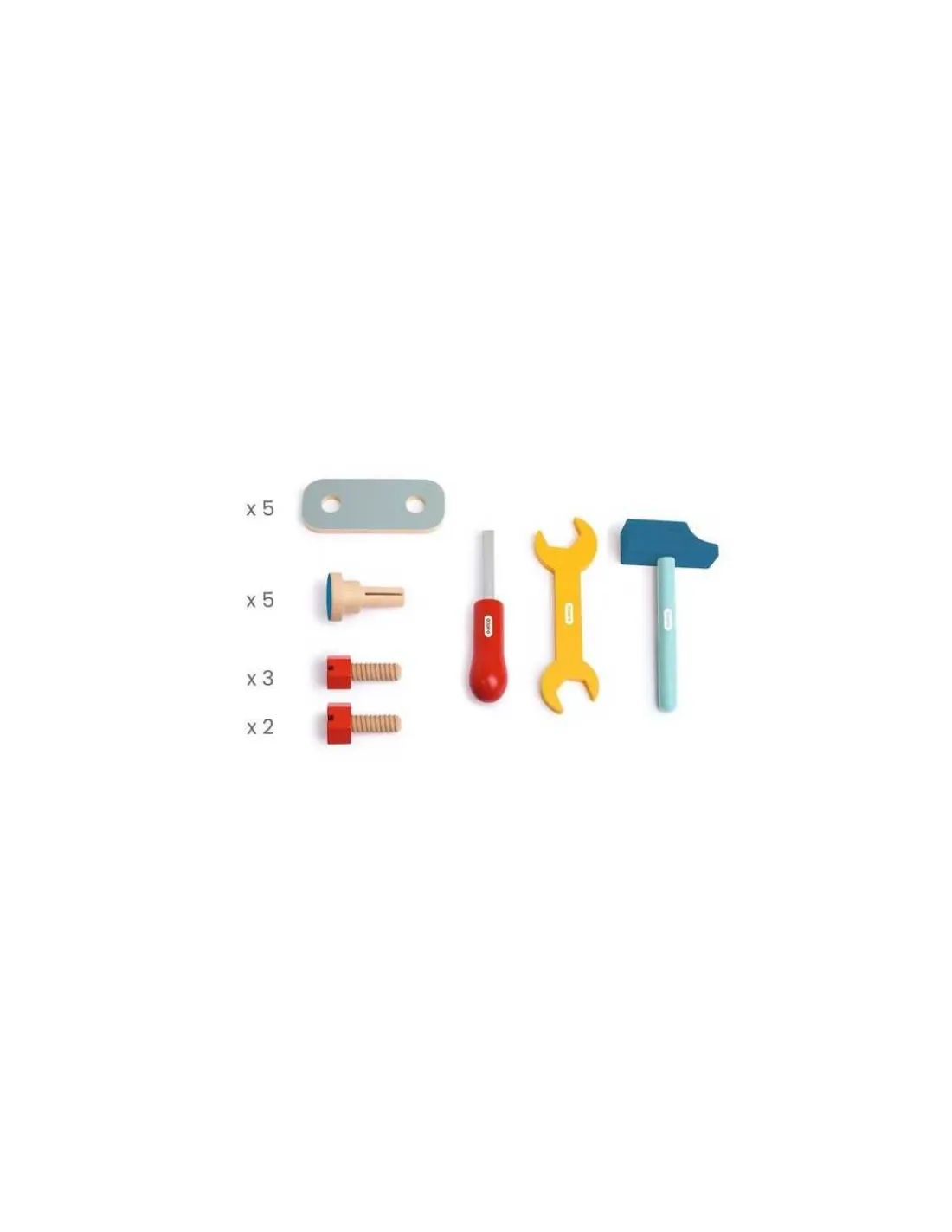 Le coffret comprend 1 établi, 1 tournevis, 1 clé plate, 1 marteau, 5 clous, 5 vis, 5 planchettes et 3 petits bacs de rangement.
