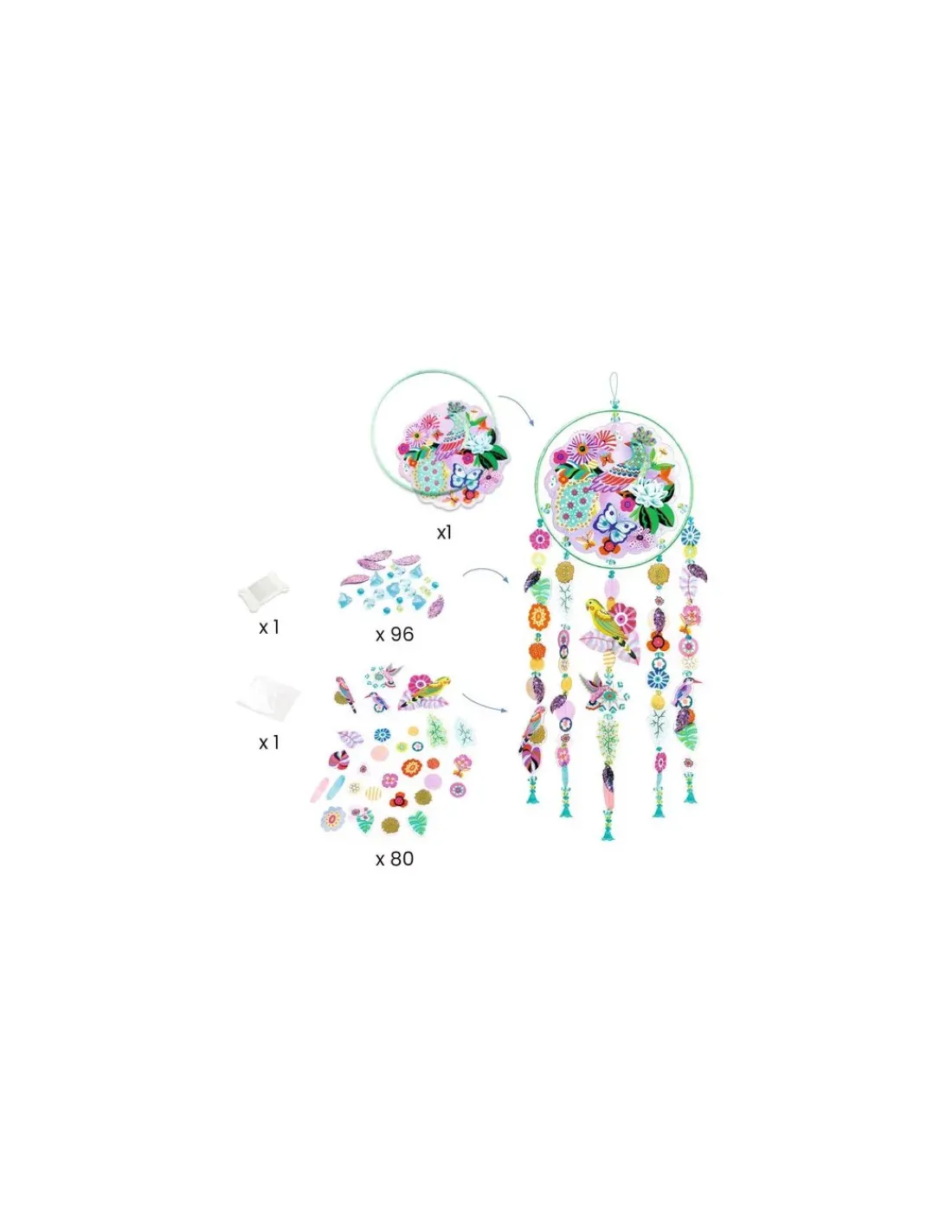 Le coffret contient plus de 80 formes décoratives, 1 anneau en métal enrubanné (16 cm de diamètre), 1 assortiment de perles facettées et sequins, 4 m de fil transparent, 1 planche de pastilles autocollantes transparentes et 1 livret détaillé qui accompagnera l’enfant pas à pas dans sa création.