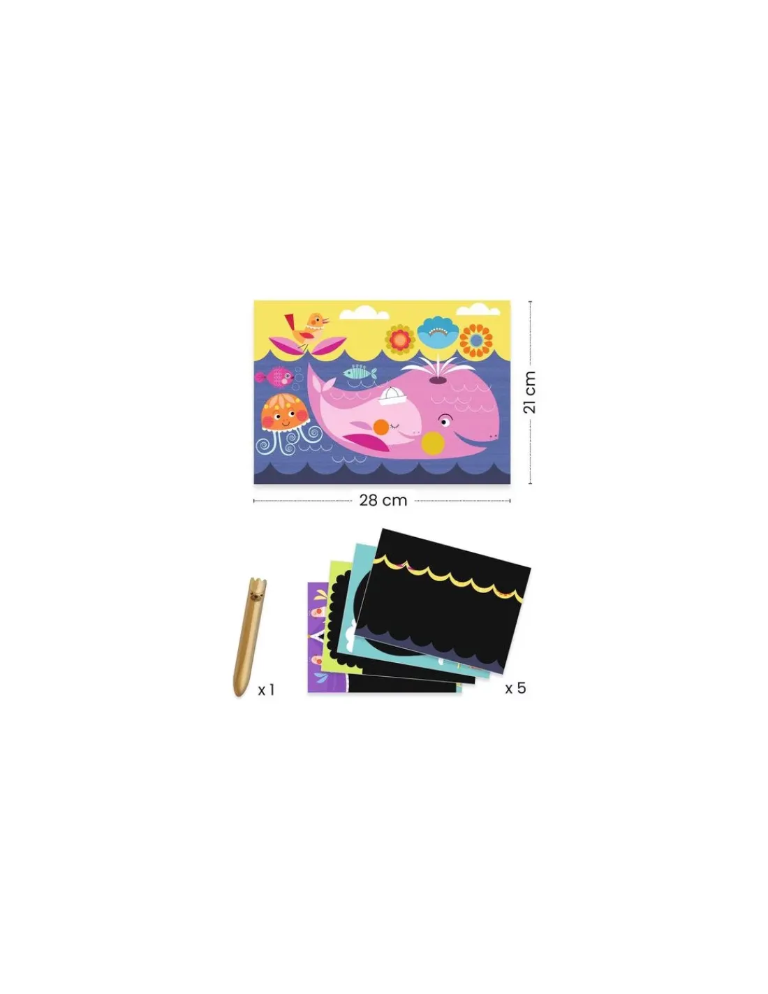 La pochette contient 5 grands tableaux à gratter, 1 outil en bois pointe arrondie et 1 livret explicatif pas à pas.