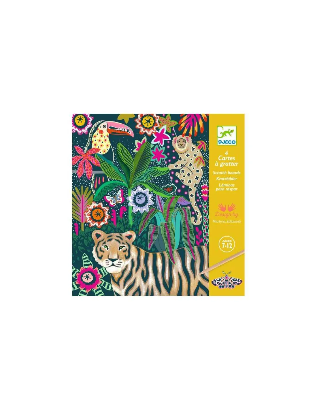 Suivez le livret d’instructions et grattez la surface de la carte pour créer, pas à pas, une magnifique illustration avec des couleurs fluo dans une ambiance chatoyante. L’enfant reproduit les motifs imaginés par l’artiste en grattant la surface à l’aide du stylet. Progressivement, des animaux tropicaux sont révélés comme par magie. Les cartes de cette pochette possèdent de l’encre fluo pour un résultat flamboyant !