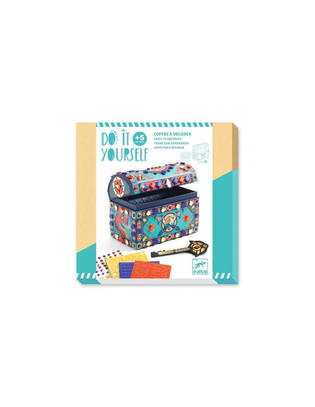 Découvrez le coffre à décorer Super trésor de la collection Do It Yourself de Djeco, un atelier créatif qui invite les enfants, dès 5 ans, à personnaliser leur propre coffre au trésor à l’aide de plus de 150 mosaïques autocollantes et strass adhésifs.