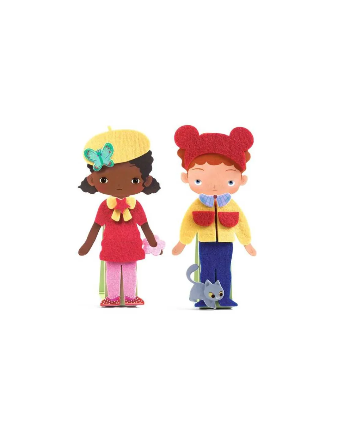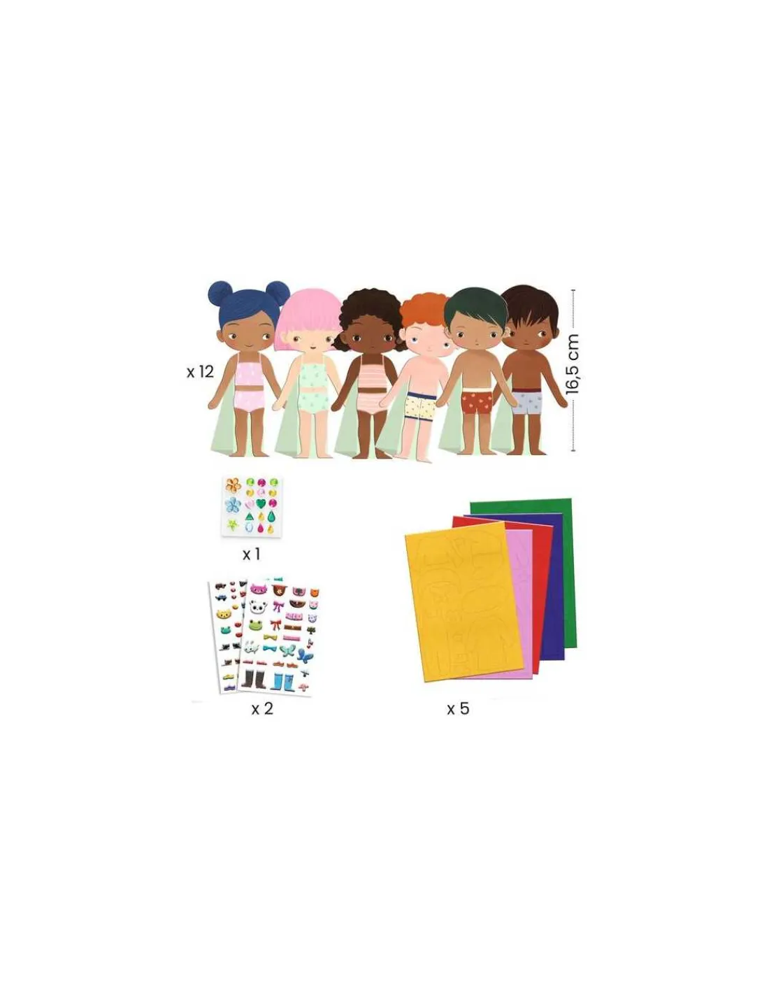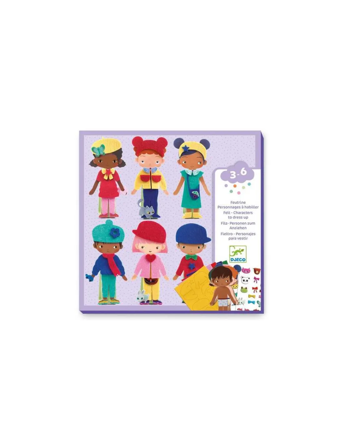 Ce coffret ludique permet aux petits de s’amuser à habiller 12 personnages, composés de 6 garçons et 6 filles, en utilisant des vêtements et accessoires en feutrine autocollante. Les personnages, réalisés en carte épaisse, tiennent debout pour faciliter la manipulation et encourager les jeux de rôle. Avec 5 planches de feutrine colorée, ainsi que 2 planches de stickers, les enfants peuvent laisser libre cours à leur créativité. Un livret explicatif accompagne le tout pour inspirer des idées d’associations.