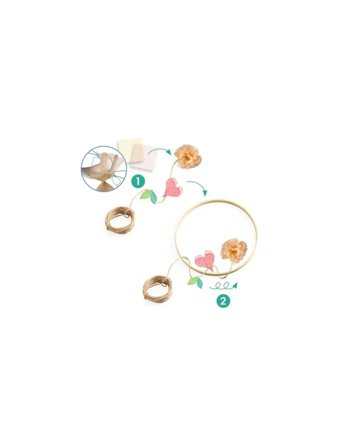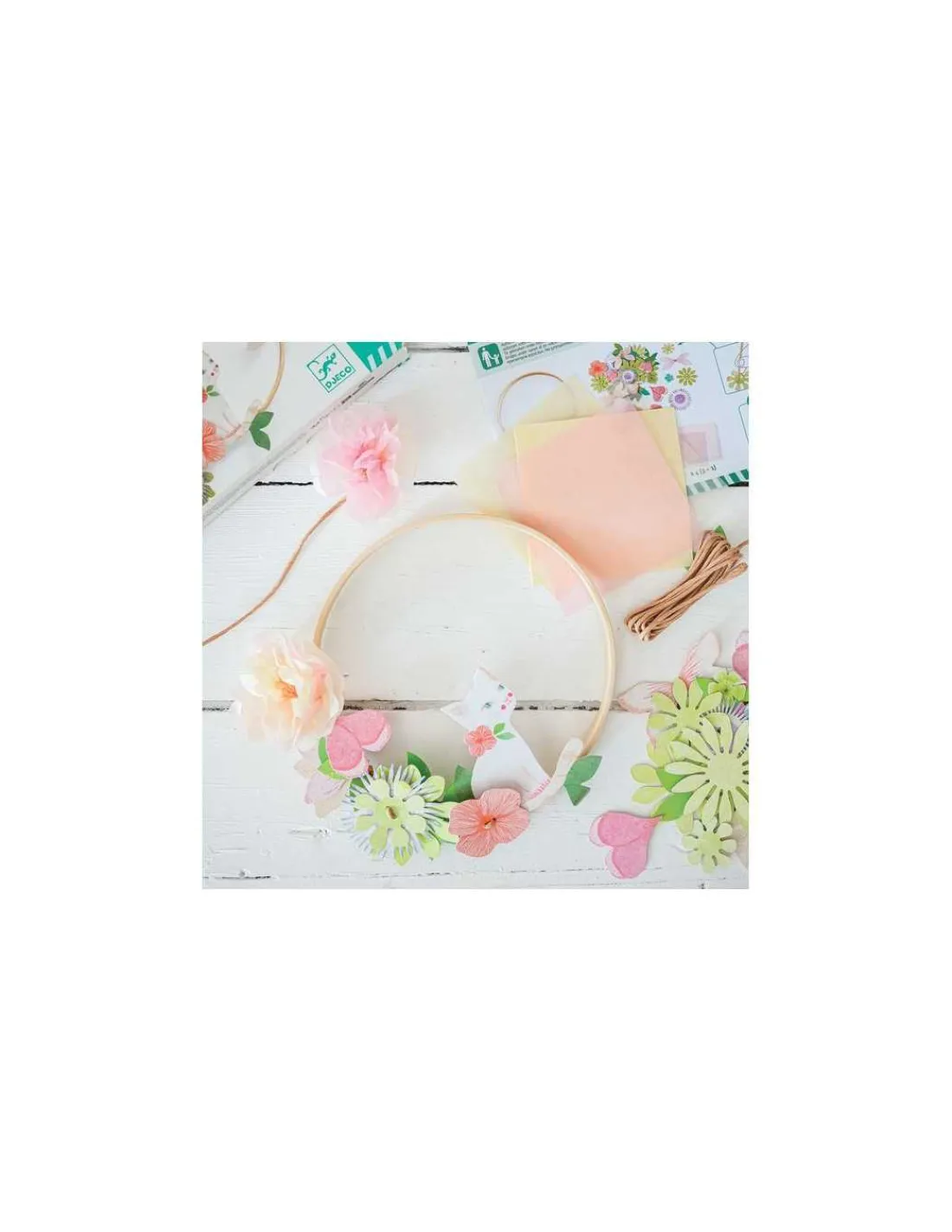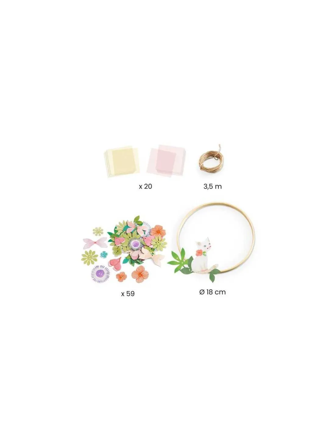 Le coffret comprend 1 anneau en bambou (18 cm), 20 feuilles de papier de soie (2 coloris), 3,5 m de fil de fer raphia, 59 éléments illustrés prépercés et 1 feuillet détaillé accompagnant l’enfant pas à pas dans sa création.