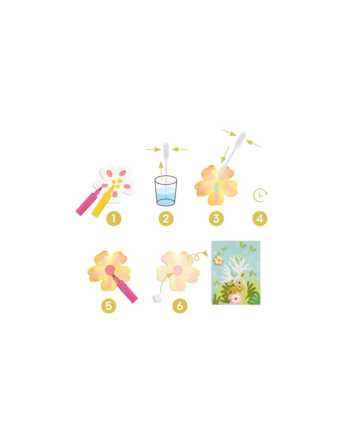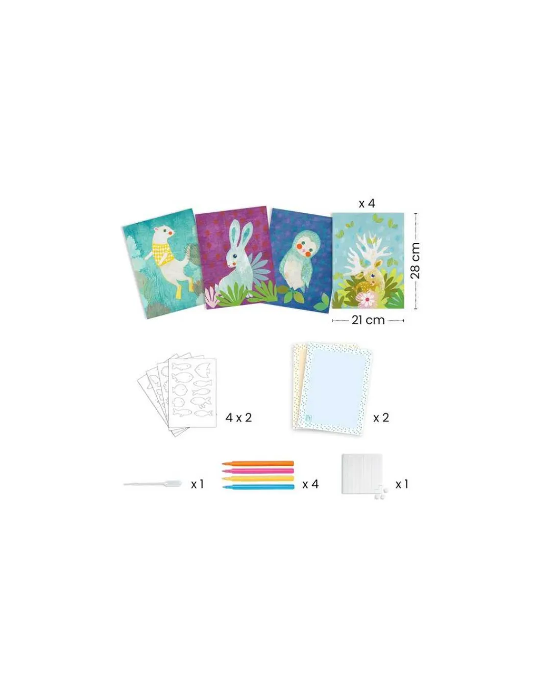 Ce coffret comprend 4 fonds illustrés, 8 feuilles de buvard prédécoupées, 4 feutres, 2 feuilles absorbantes, 1 pipette, des stickers double-face et 1 livret explicatif.