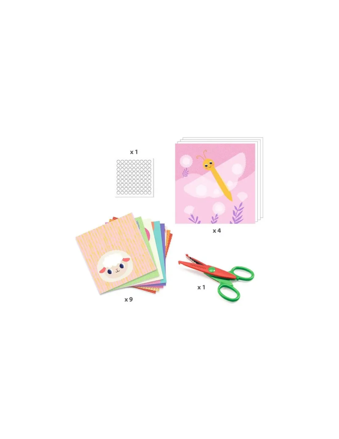 Ce coffret comprend 9 feuilles illustrées à découper, 4 cartes illustrées à décorer, 1 paire de ciseaux crantés, 1 planche d’autocollants double-face et 1 livret explicatif pas à pas.